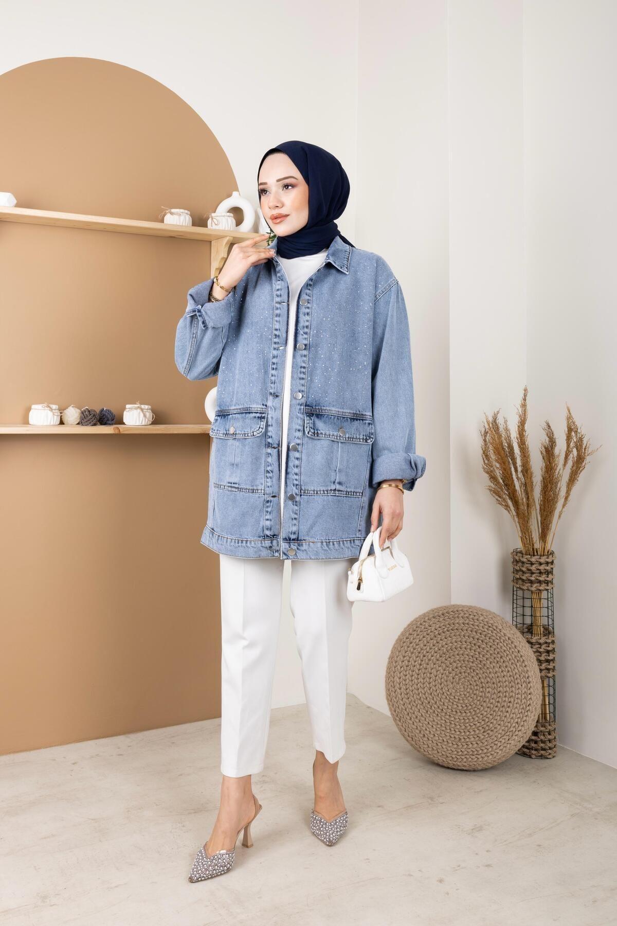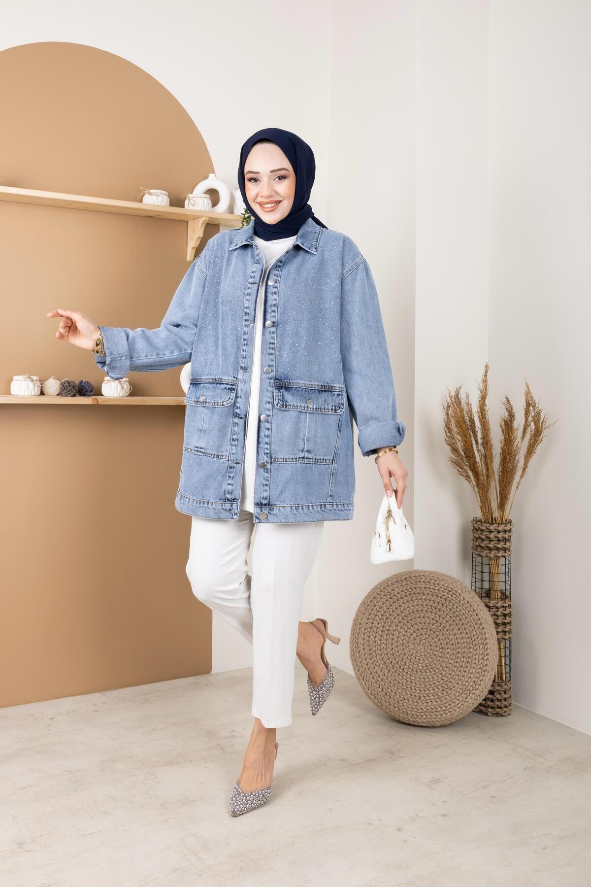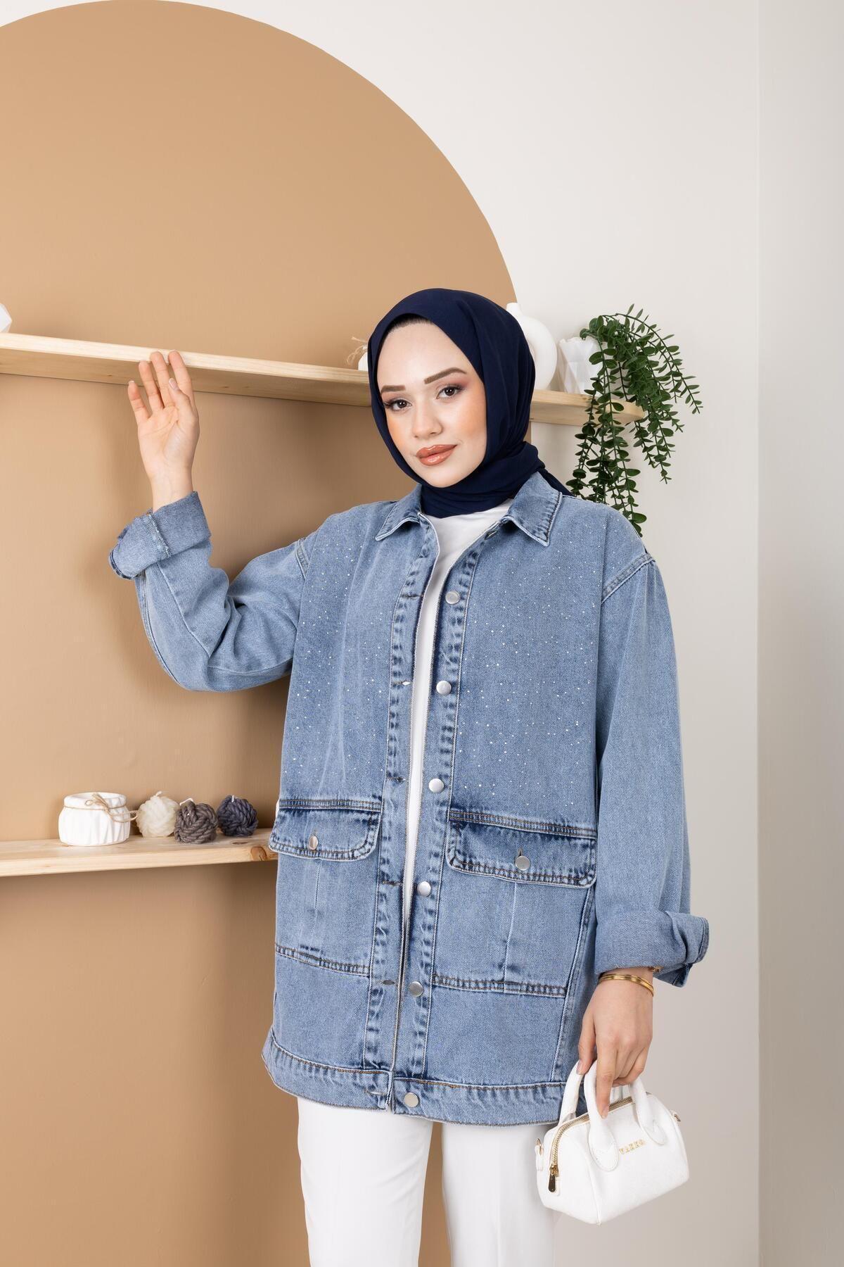 KADIN TAŞ DETAYLI CEPLİ KOT CEKET KADIN TAŞ DETAYLI CEPLİ KOT CEKET 705 42