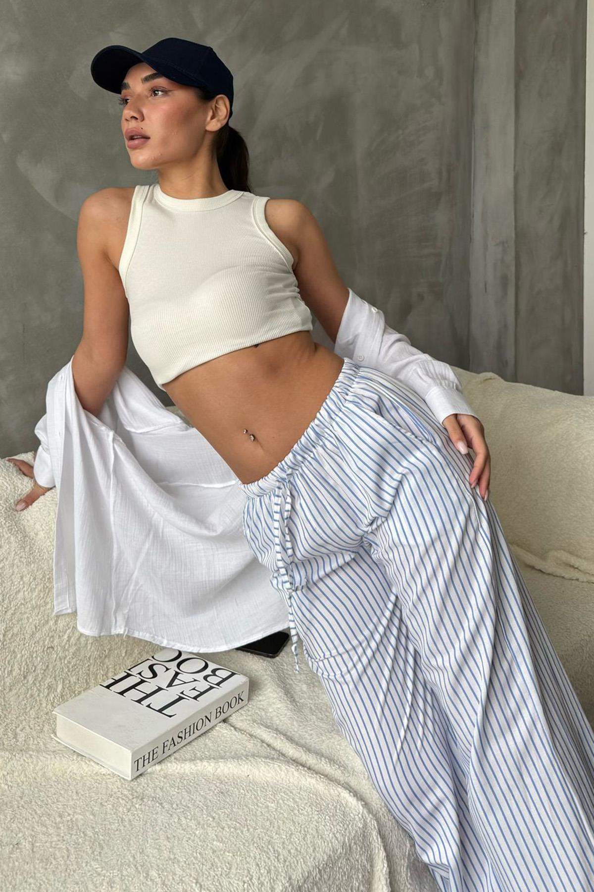 Mavi Beli Ayarlanabilir Çizgili Cepli Bol Paça Kadın Pantolon Mg2312 Mavi Beli Ayarlanabilir Çizgili Cepli Bol Paça Kadın Pantolon Mg2312 XL