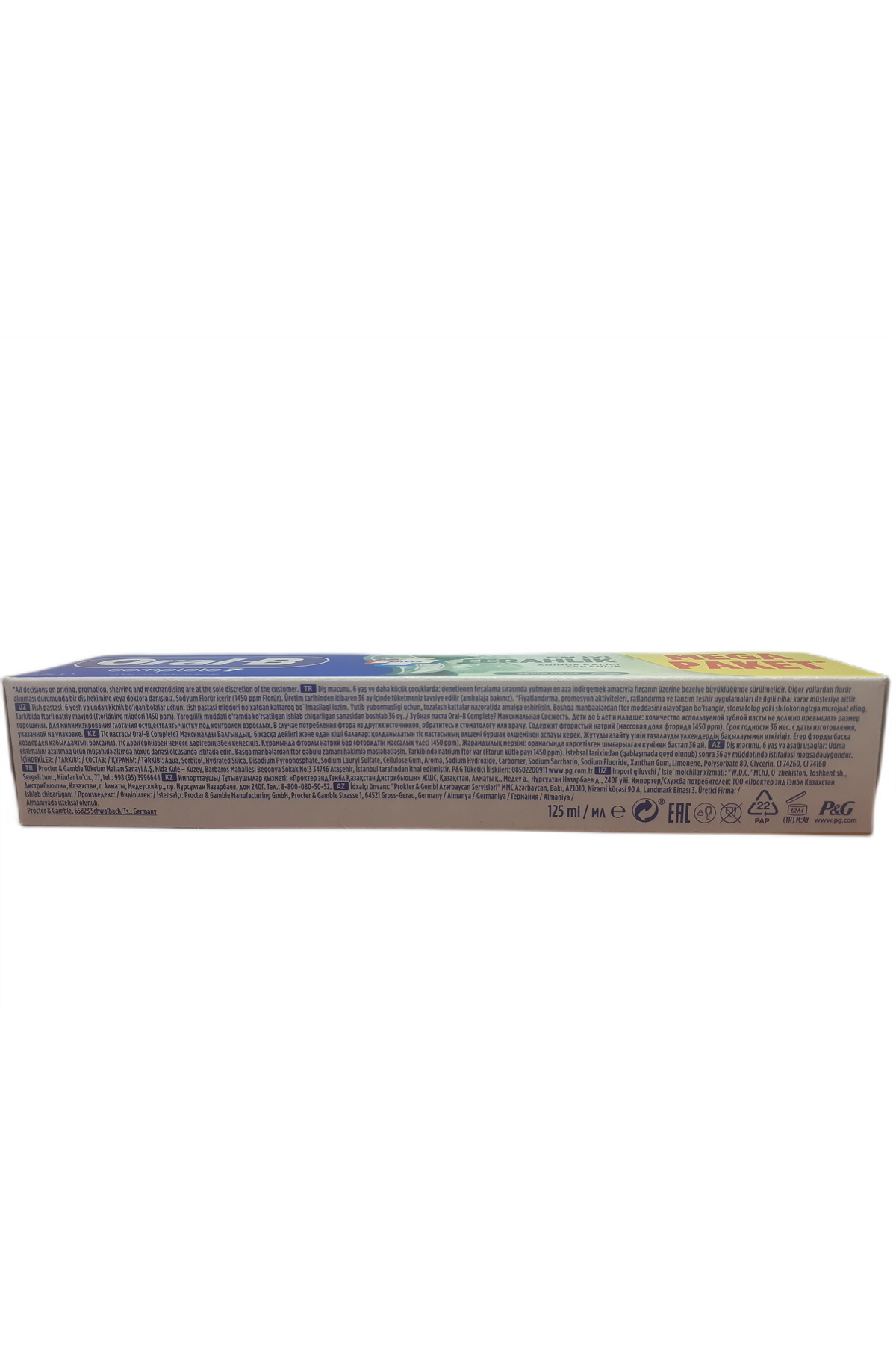 - Diğer Özellikler : TR Diş macunu. 6 yaş ve daha küçük çocuklar: denetlenen fırçalama sırasında yutmayı en aza indirmek amacıyla fırçanın üzerine bezelye büyüklüğünde sürülmelidir. Diğer yollardan florür alınması durumunda bir diş hekimine veya doktora danışınız. Sodyum Florür içerir (1450 ppm Florür).