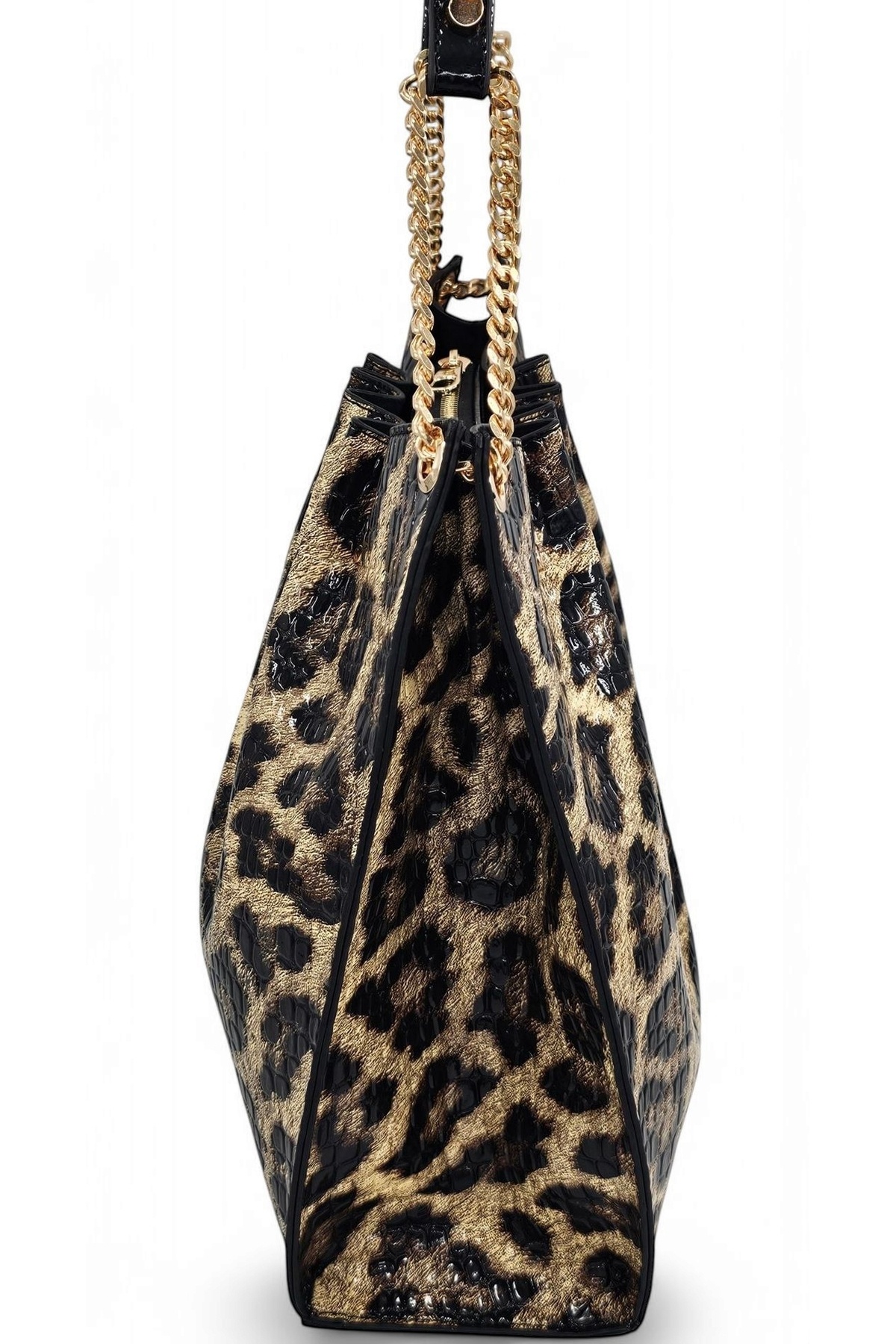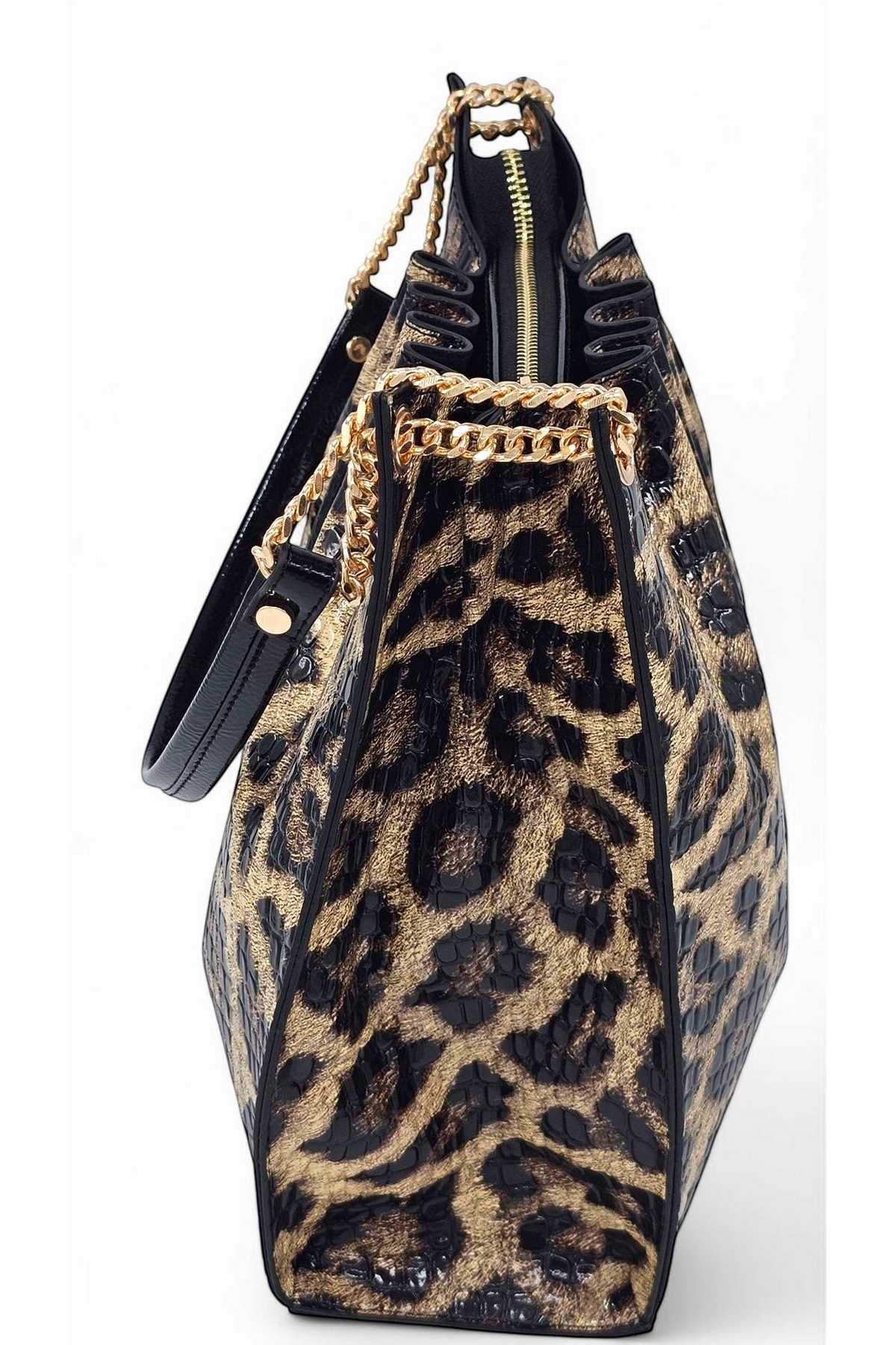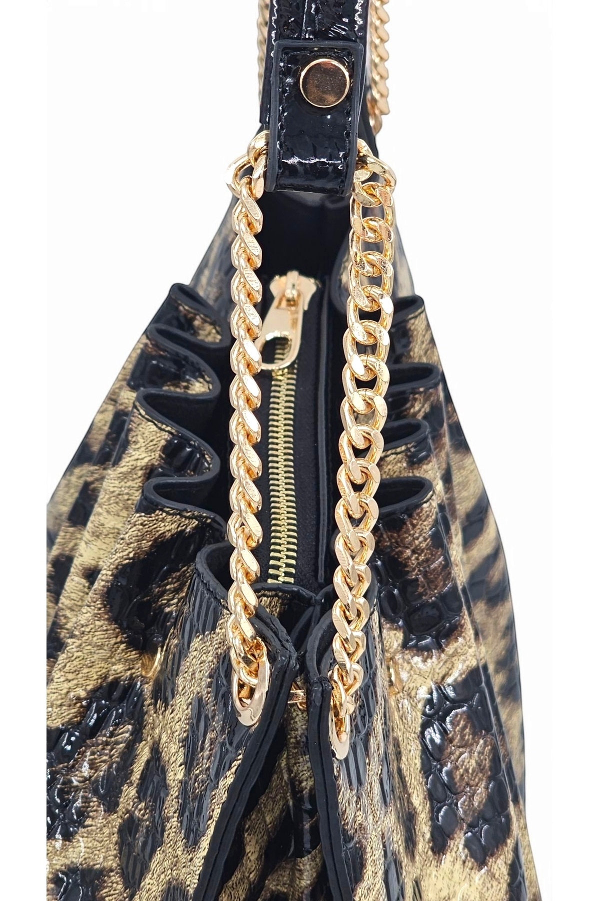 Siyah Rugan Baskılı Leopar Desenli Zincir Detaylı Pileli Kadın Omuz Çantası Siyah Rugan Baskılı Leopar Desenli Zincir Detaylı Pileli Kadın Omuz Çantası E-4007 Büyük Boy