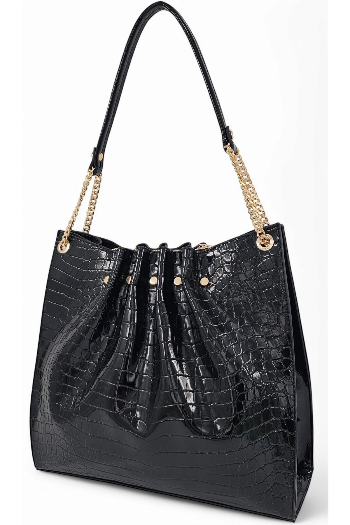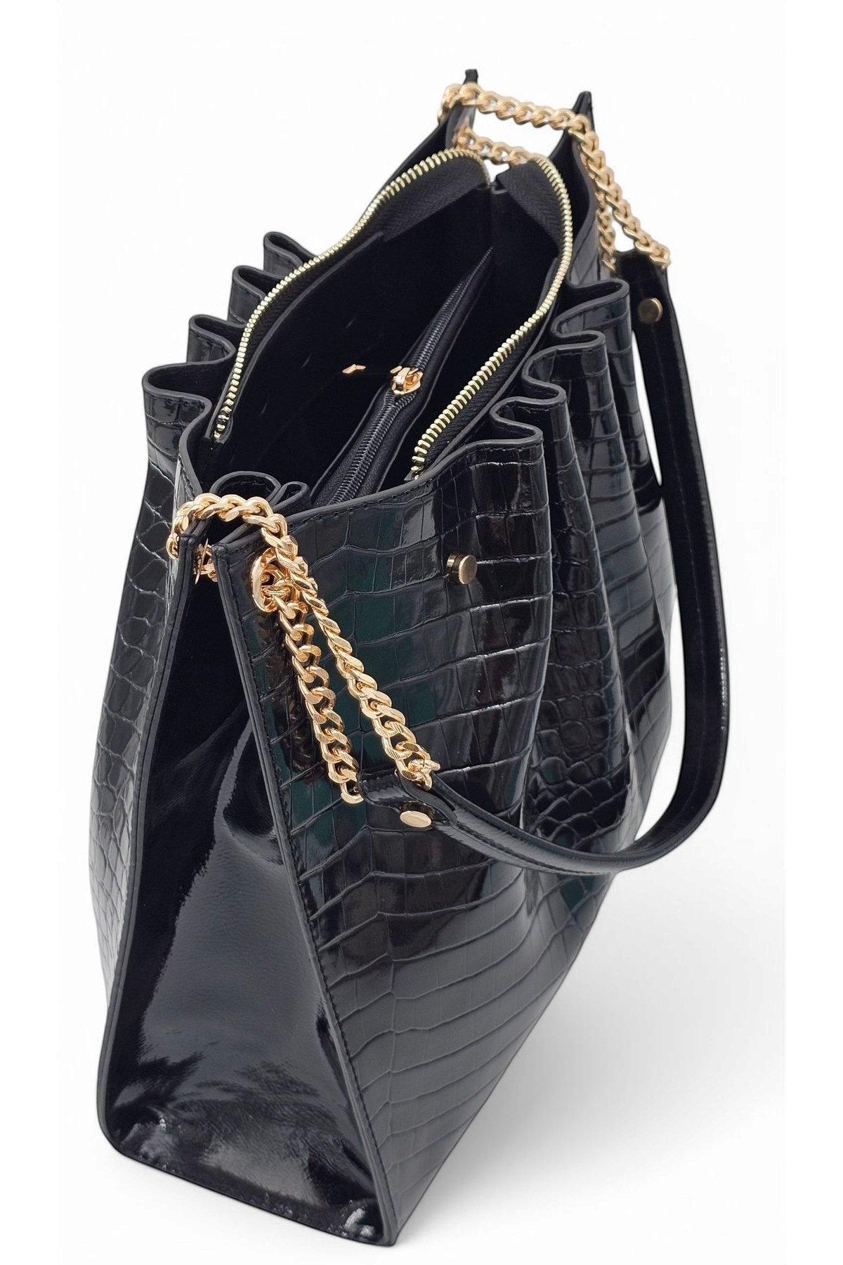 Siyah Rugan Kroko Desenli Zincir Detaylı Pileli Kadın Omuz Çantası Siyah Rugan Kroko Desenli Zincir Detaylı Pileli Kadın Omuz Çantası E-4007 Büyük Boy
