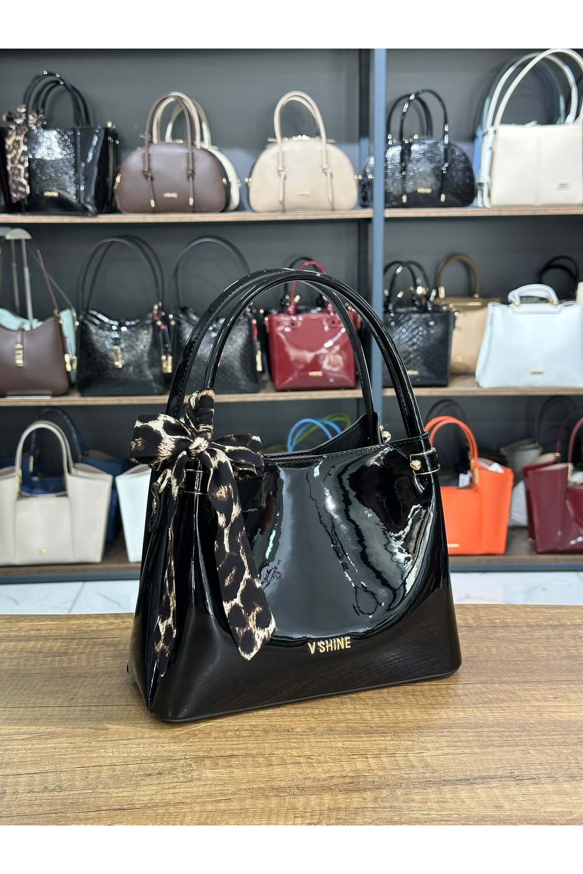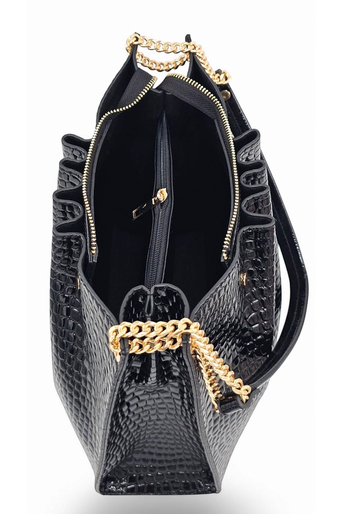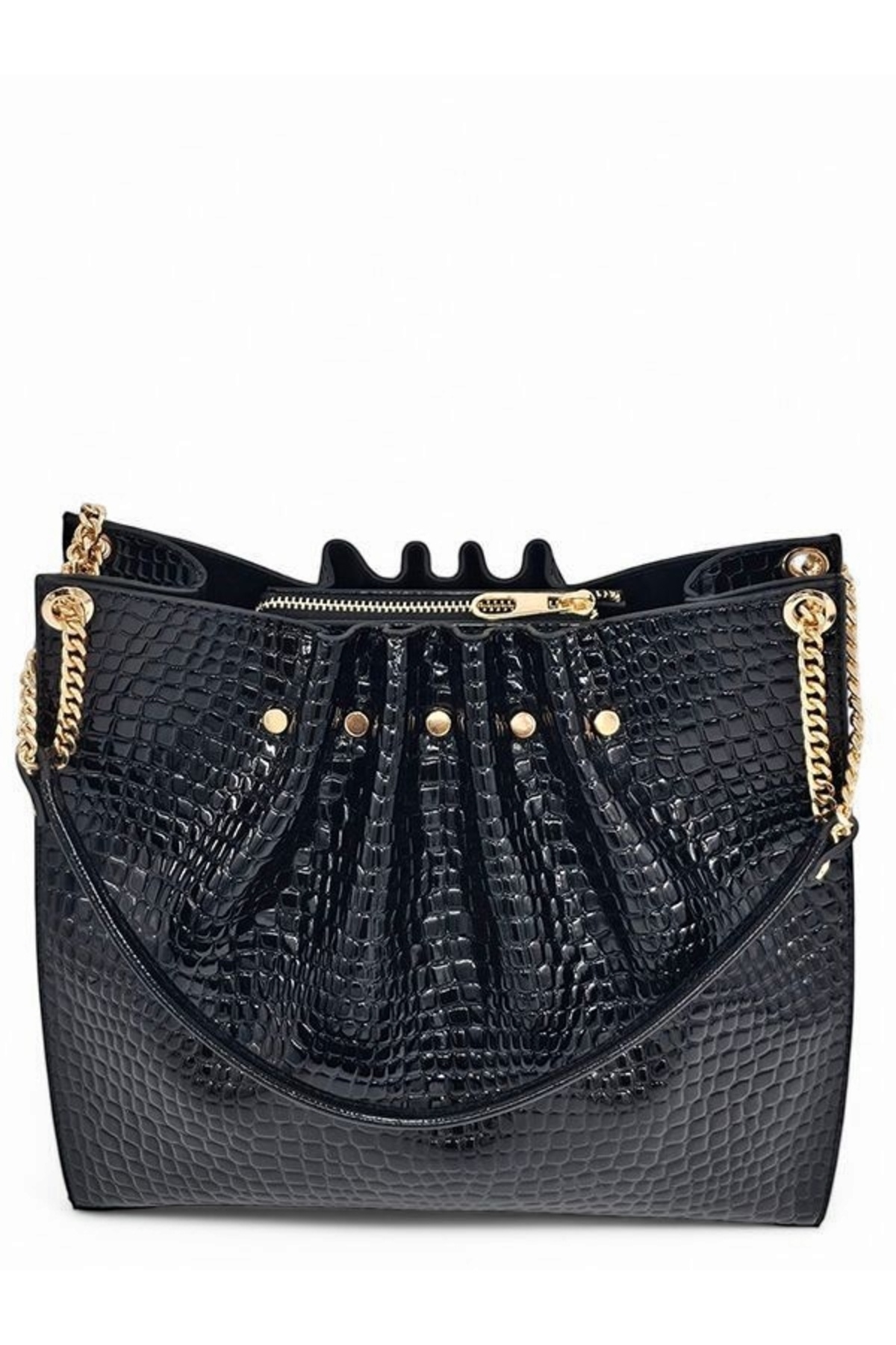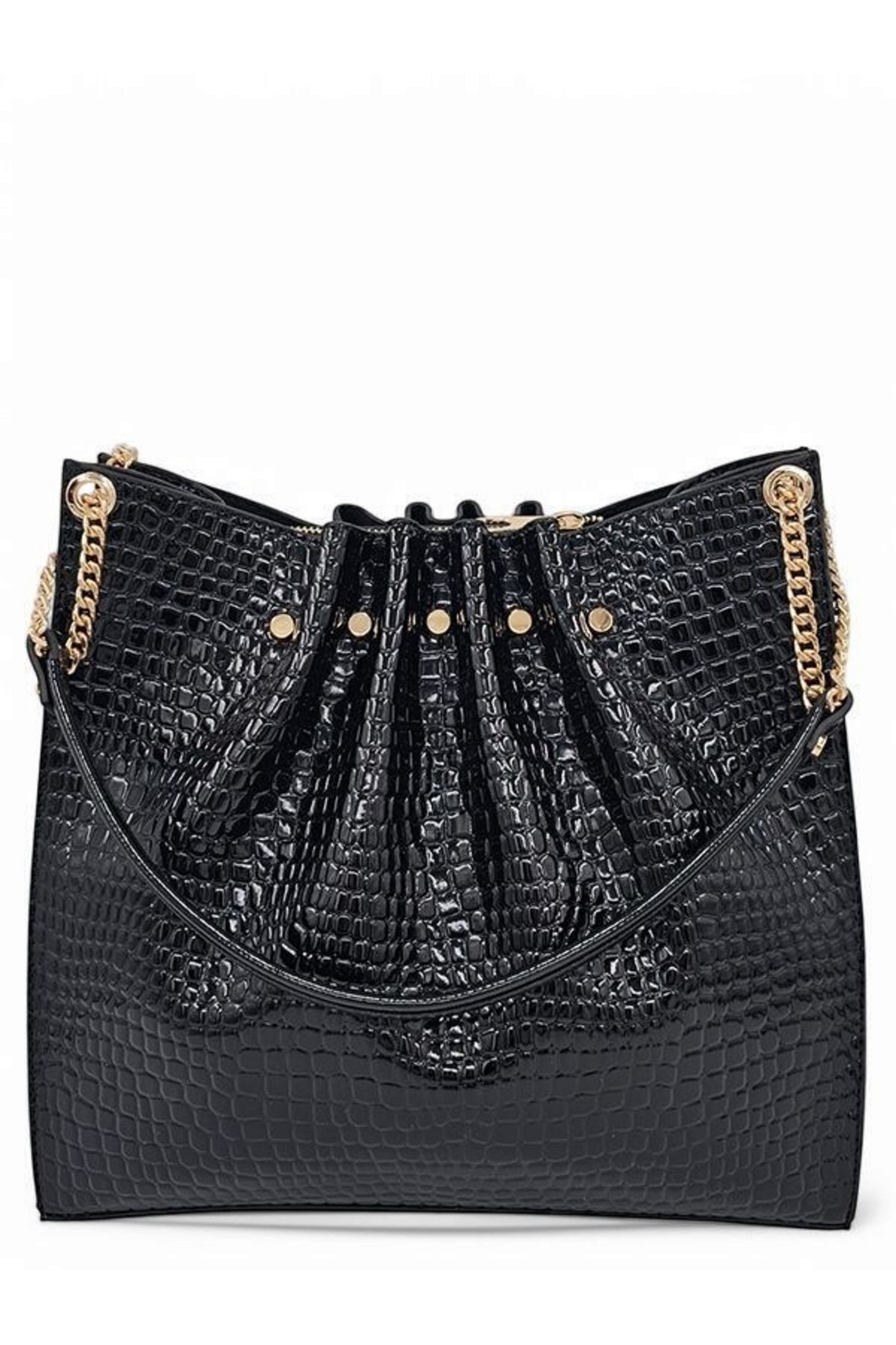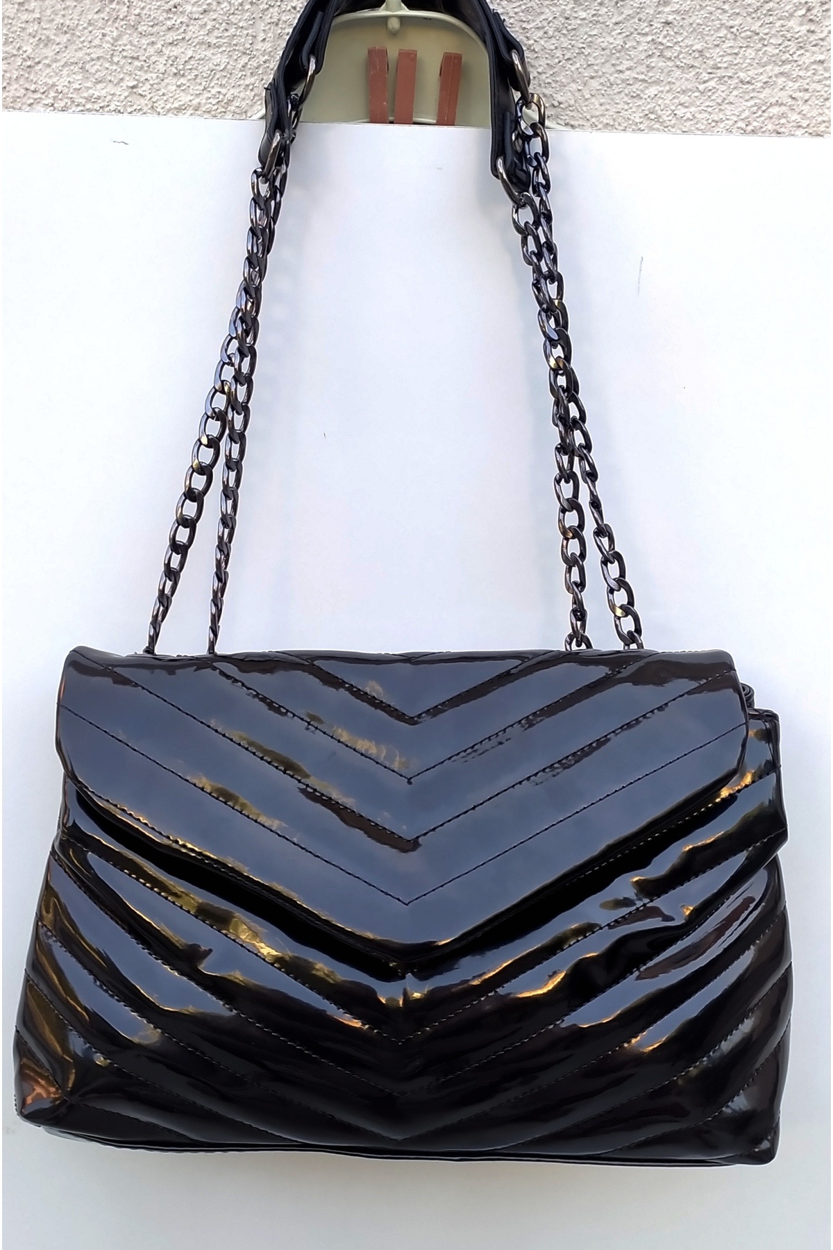 Siyah Rugan Damla Desenli Zincir Detaylı Pileli Kadın Omuz Çantası Siyah Rugan Damla Desenli Zincir Detaylı Pileli Kadın Omuz Çantası E-4007 Büyük Boy