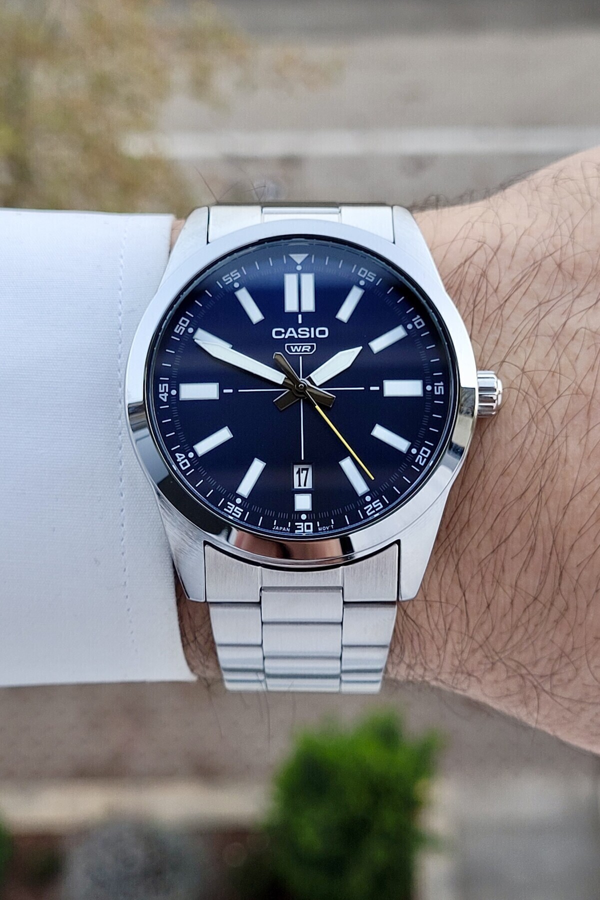 Kadranı Lacivert Kordonu Gümüş Renk Erkek Kol Saati Kadranı Lacivert Kordonu Gümüş Renk Erkek Kol Saati CAS.MTP-1214A-8AVDF Orta Boy