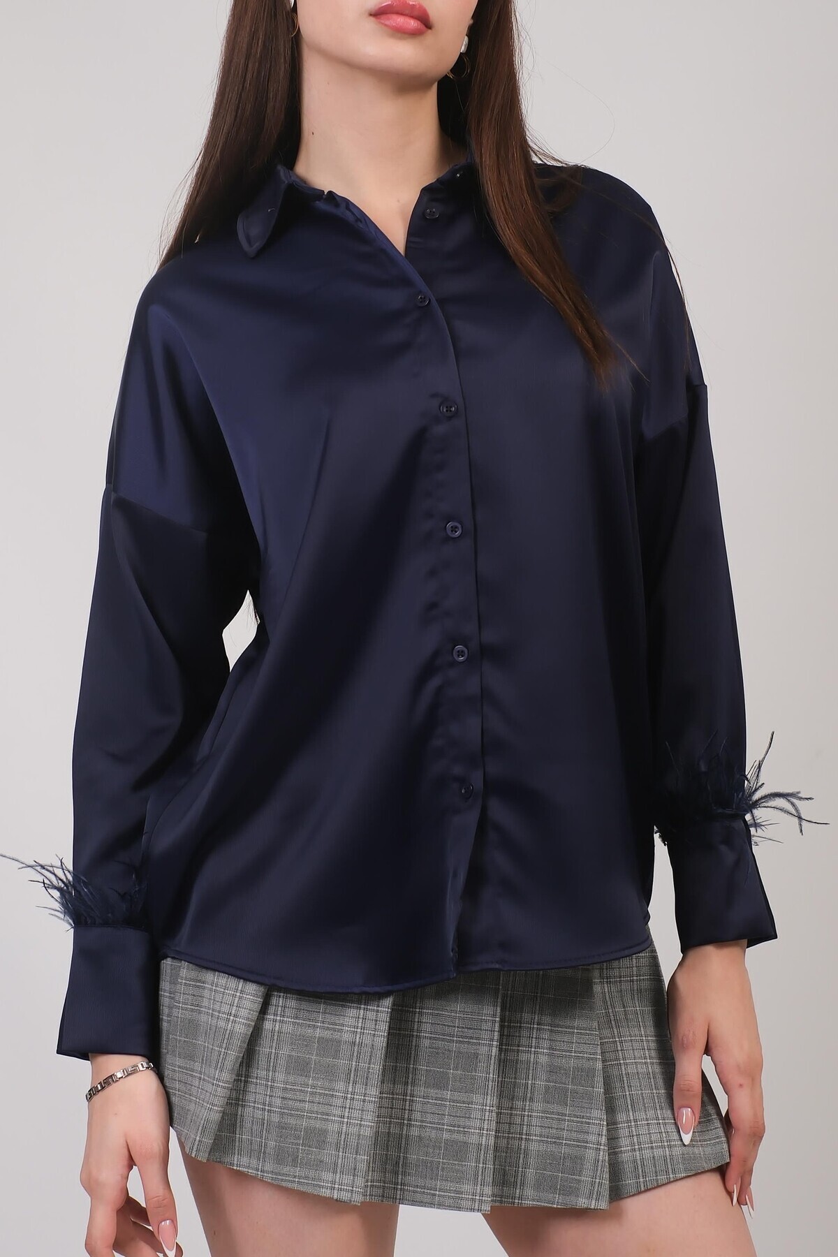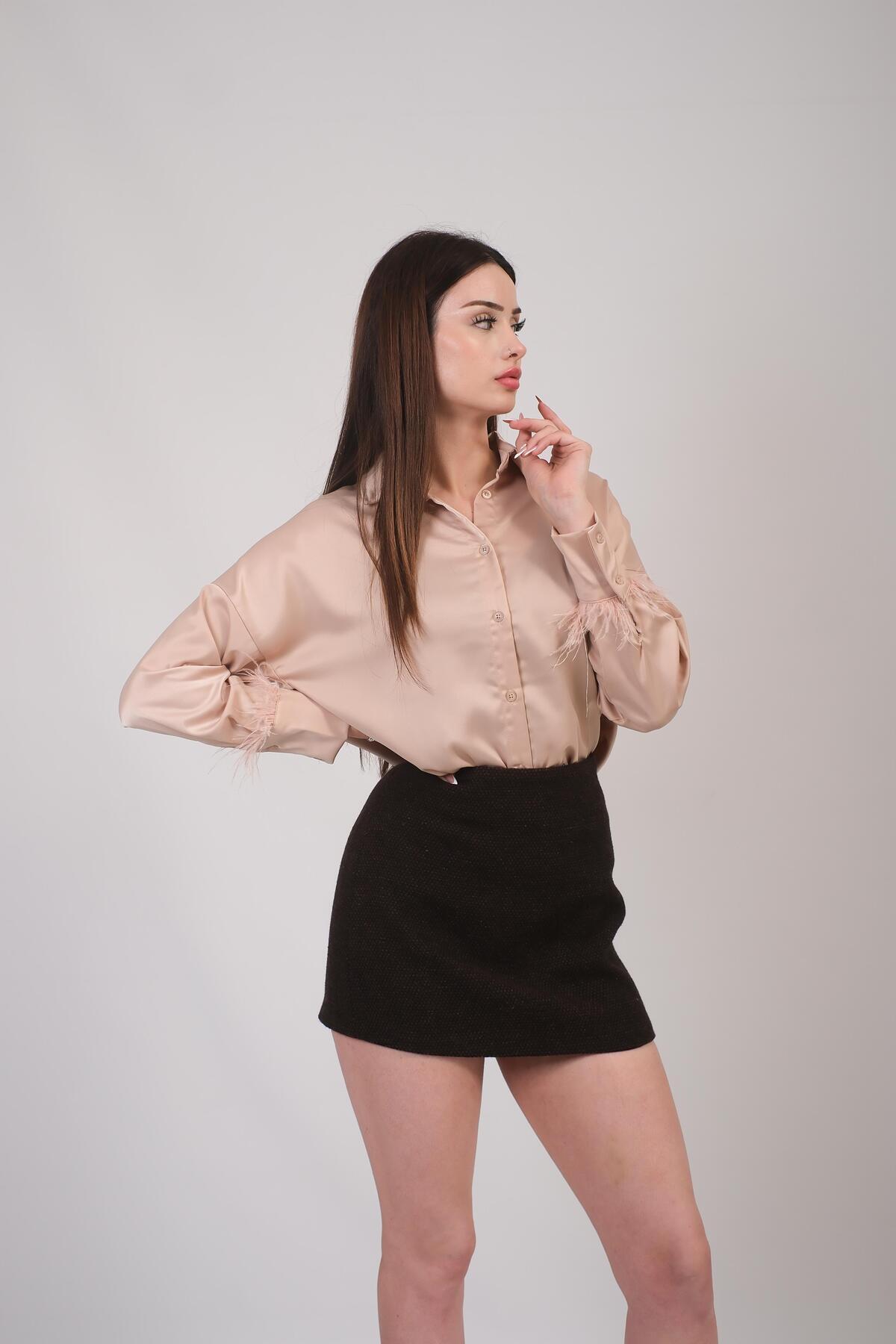 Oversize Model Kolu Tüy Detay Bej Saten Gömlek Oversize Model Kolu Tüy Detay Bej Saten Gömlek hslg2511 L
