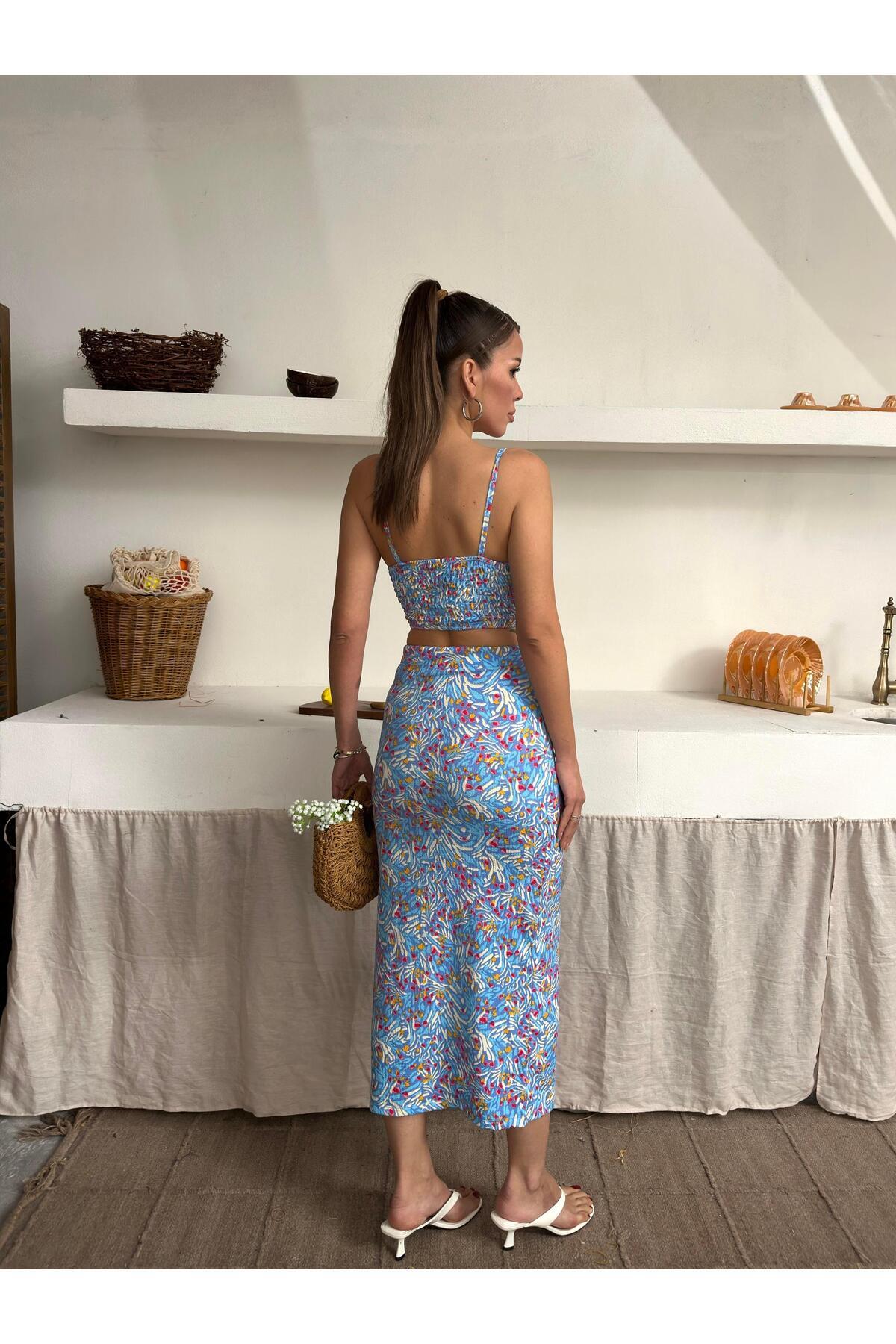 Renkli Desenli Mavi Kalp Yaka Crop ve Yırtmaçlı Midi Etek Takım Renkli Desenli Mavi Kalp Yaka Crop ve Yırtmaçlı Midi Etek Takım RDKYC0003 L