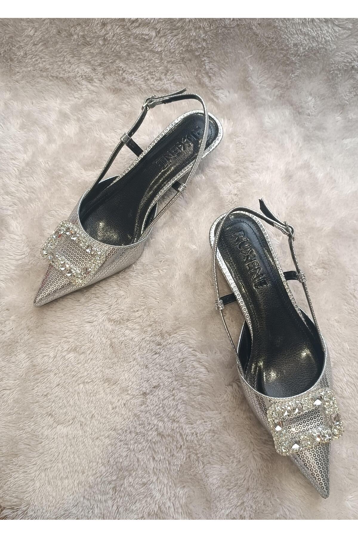 DUSK GÜMÜŞ TOKA DETAYLI PUANTİYELİ SİVRİ BURUN 4 CM TOPUKLU AYAKKABI DUSK GÜMÜŞ TOKA DETAYLI PUANTİYELİ SİVRİ BURUN 4 CM TOPUKLU AYAKKABI RX.01.01.25.28.00.00 40