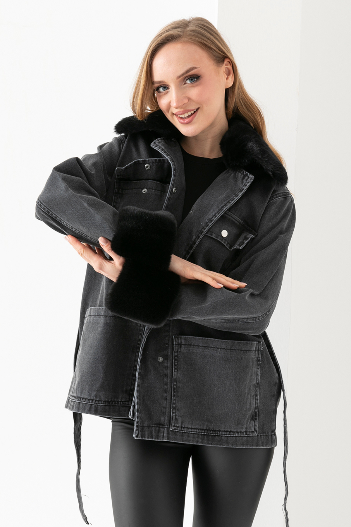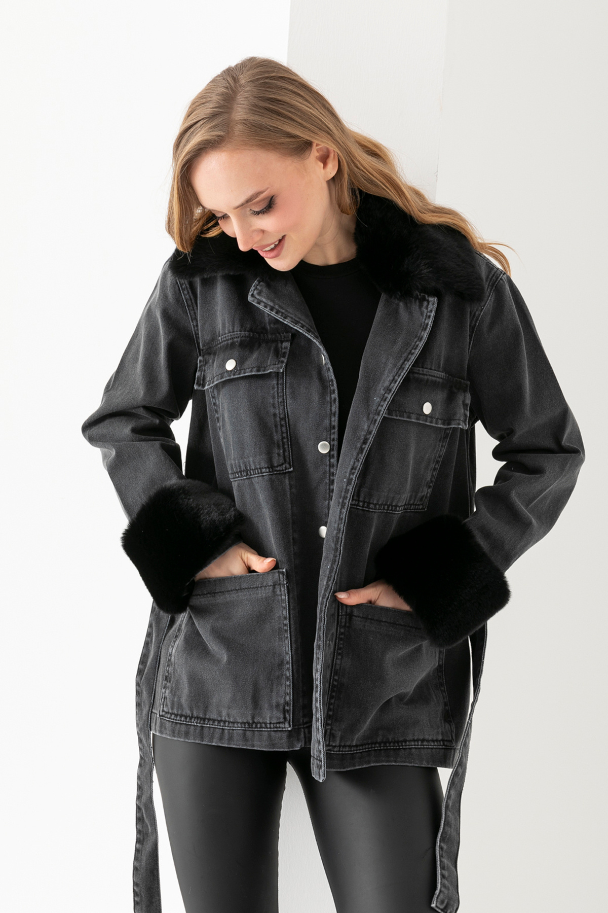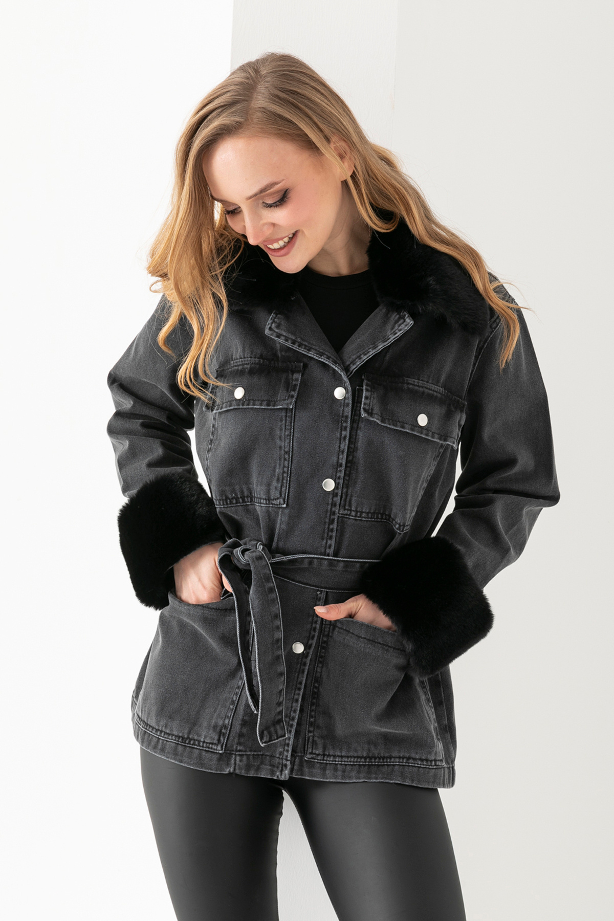KÜRKLÜ SİYAH DENİM CEKET KÜRKLÜ SİYAH DENİM CEKET KRKSYH Standart