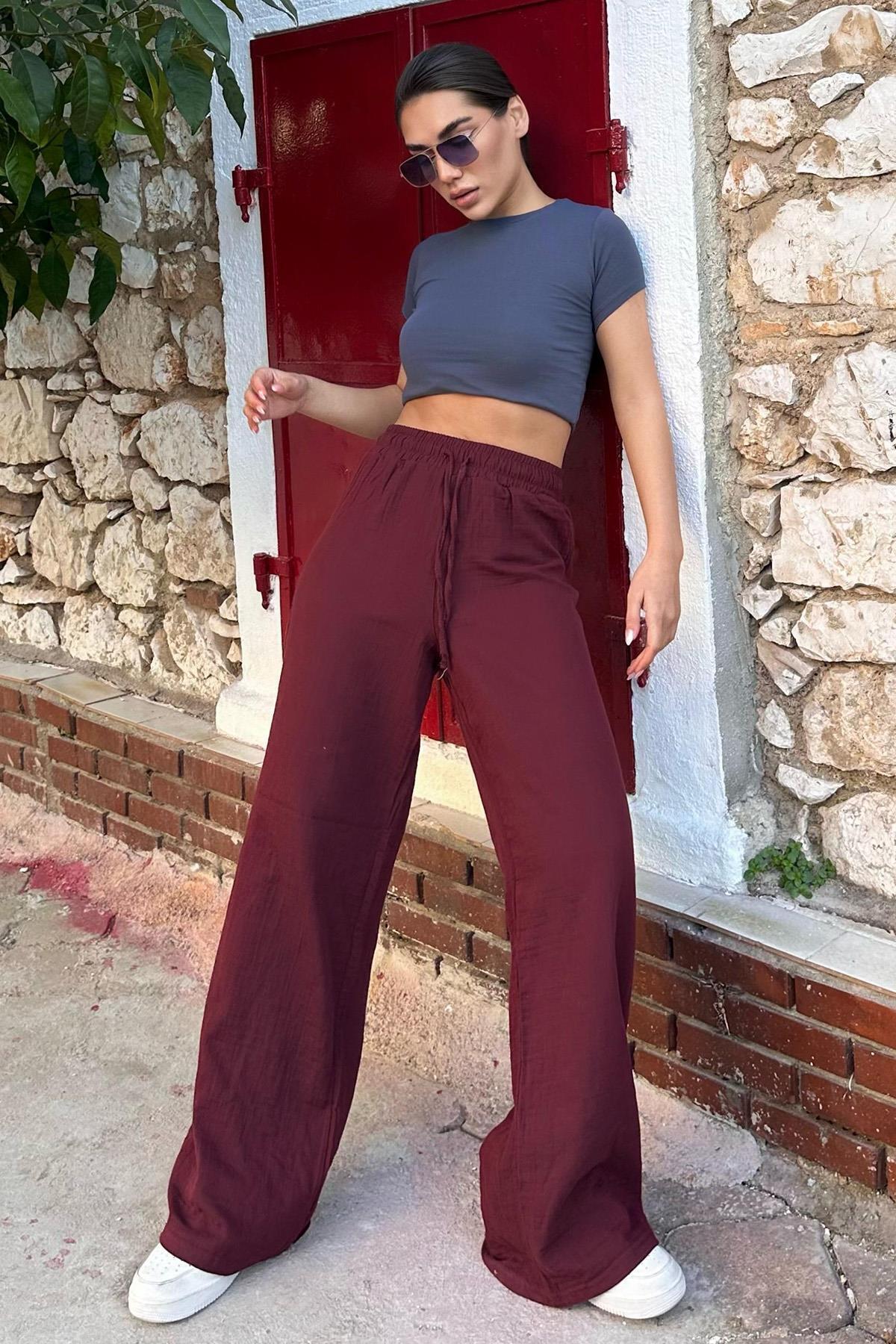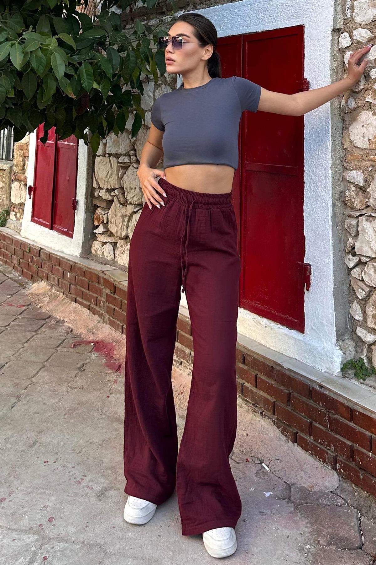 Bordo Bol Paça Müslin Kadın Pantolon MG1980 Bordo Bol Paça Müslin Kadın Pantolon MG1980 XL