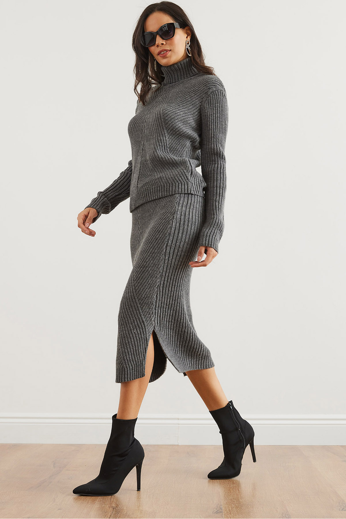 Kadın Gri Saç Örgü Detaylı Etekli Triko Takım TKM-19000357 Kadın Gri Saç Örgü Detaylı Etekli Triko Takım TKM-19000357 تک سایز
