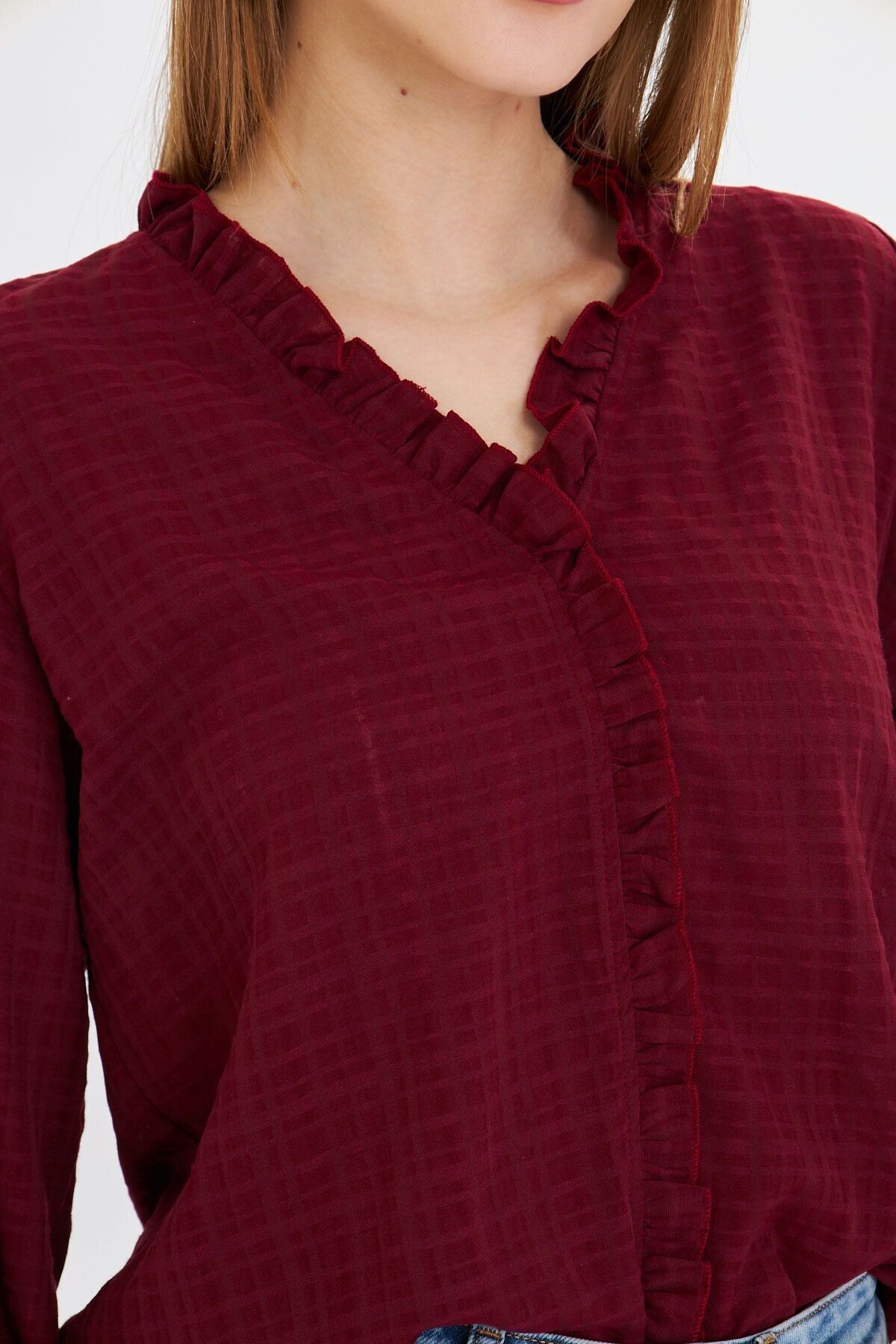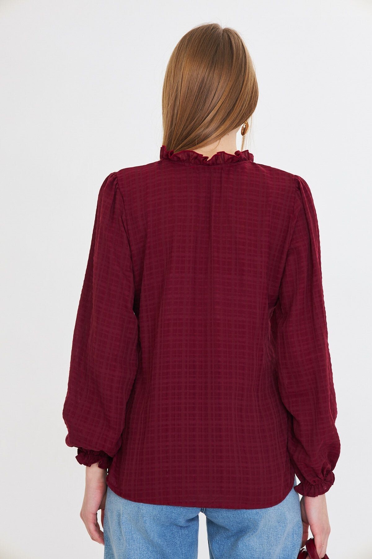 Kadın Bordo Yakası Ve Önü Fırfır Detaylı Kolları Lastikli Uzun Kollu Bluz ARM-25K001030 Kadın Bordo Yakası Ve Önü Fırfır Detaylı Kolları Lastikli Uzun Kollu Bluz ARM-25K001030 XL