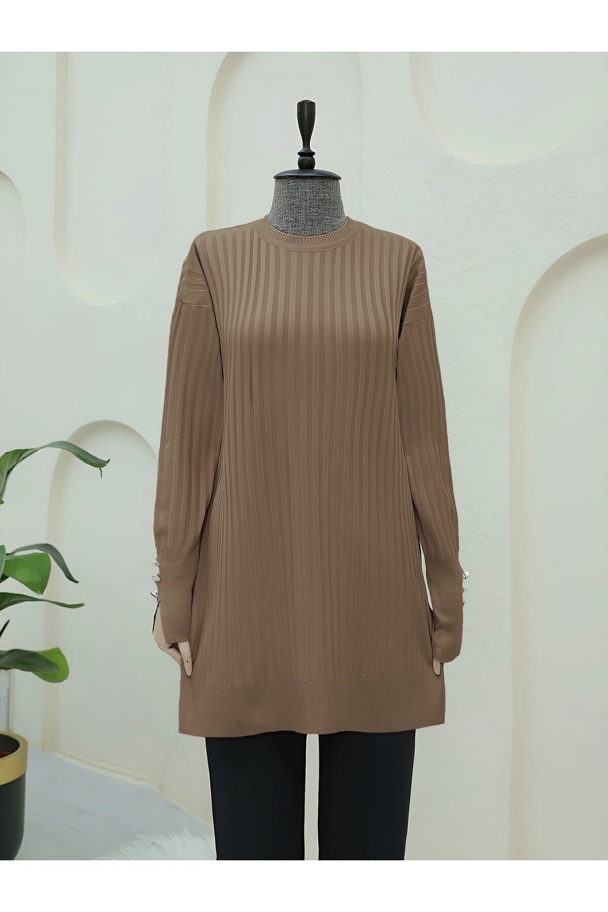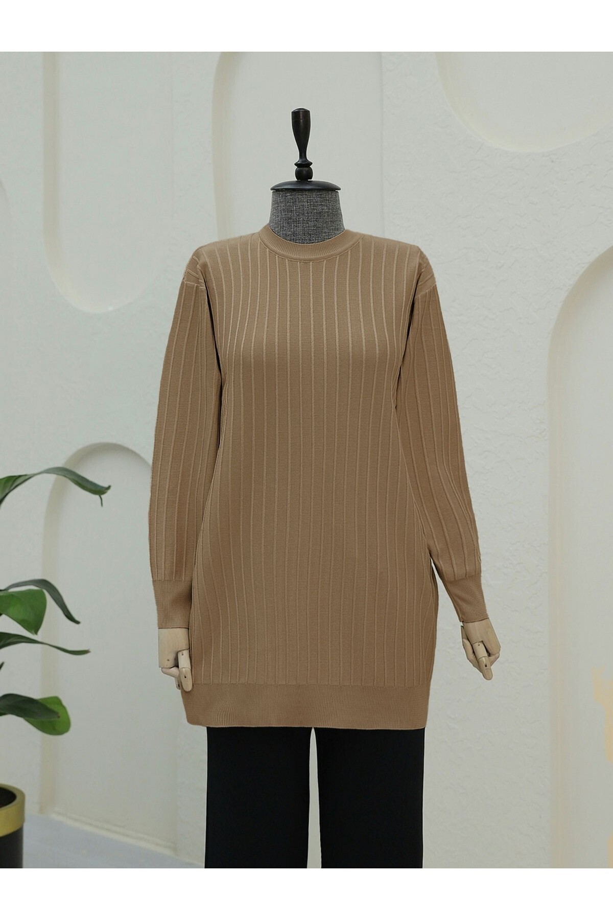 Yuvarlak Yaka Kalın Çizgili Salaş Triko Tunik -Vizon Yuvarlak Yaka Kalın Çizgili Salaş Triko Tunik -Vizon TY280-3174 Standart