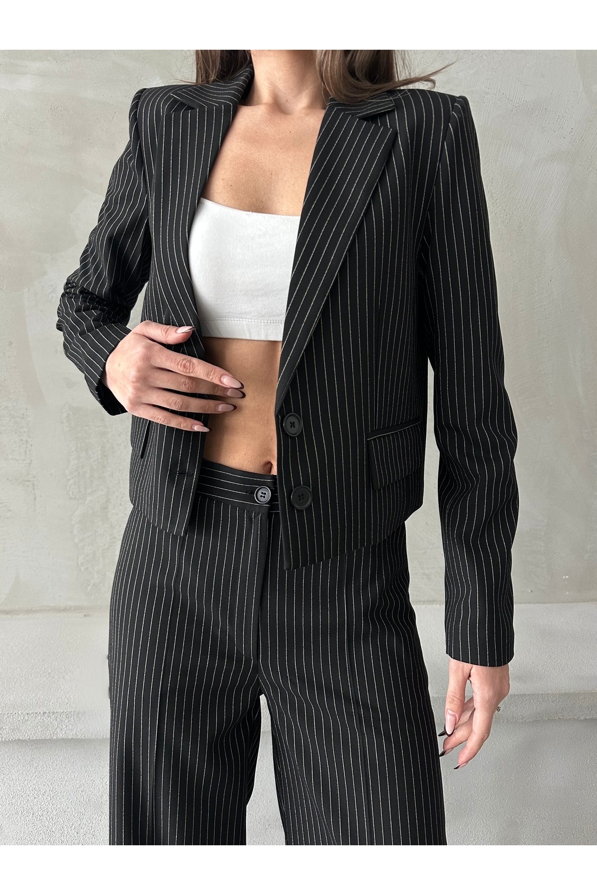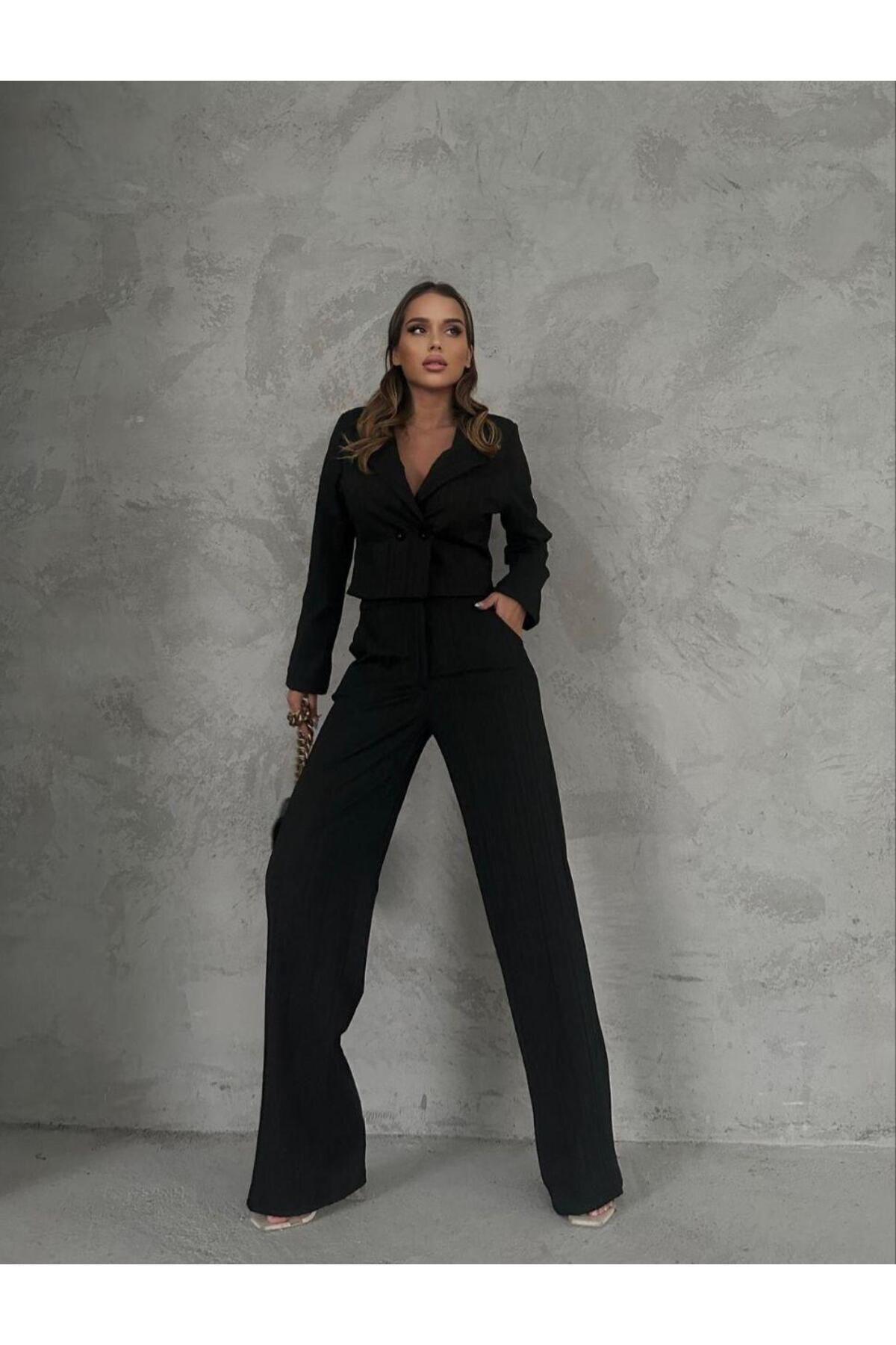 Palazzo Pantolon Düğmeli ve Crop Ceket İkili Çizgili Takım Palazzo Pantolon Düğmeli ve Crop Ceket İkili Çizgili Takım 25SWS9038 M