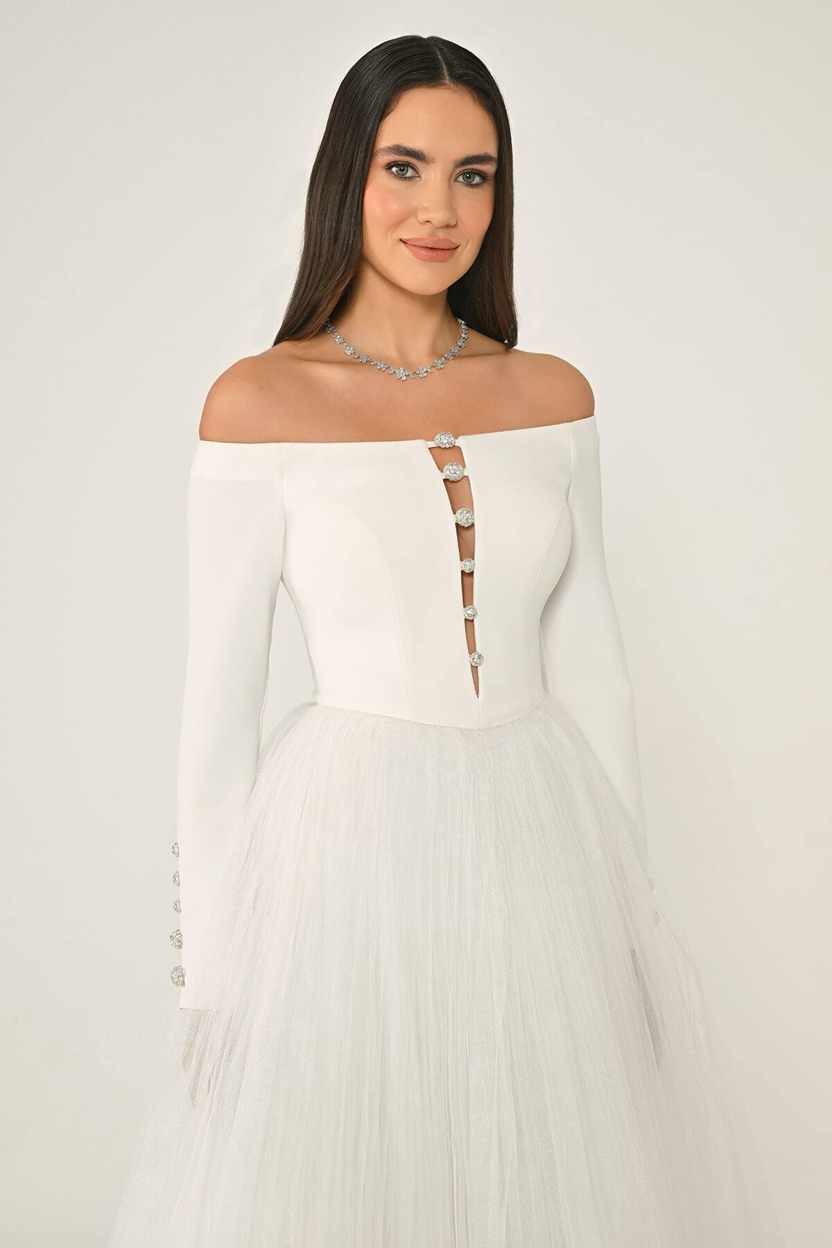 KADIN ABİYE DEKOLTELİ OMZU AÇIK UZUN KOLLU ETEGİ PLİSELİ TÜL MİDİ ELBİSE KADIN ABİYE DEKOLTELİ OMZU AÇIK UZUN KOLLU ETEGİ PLİSELİ TÜL MİDİ ELBİSE 6844 46