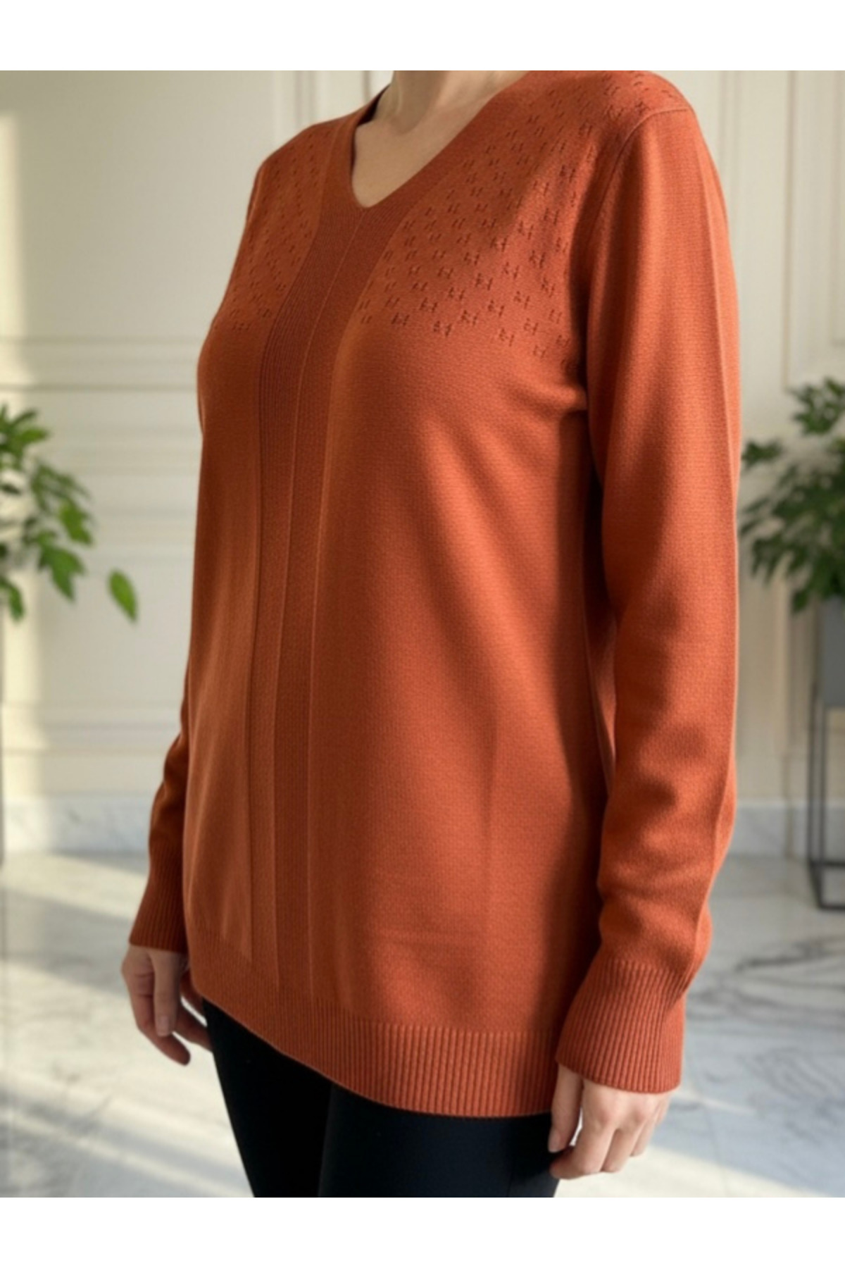 TEKTRİKO Önü Fitilli V Yaka Ajurlu Bluz / Kiremit TEKTRİKO Önü Fitilli V Yaka Ajurlu Bluz / Kiremit TKTR-593 XL