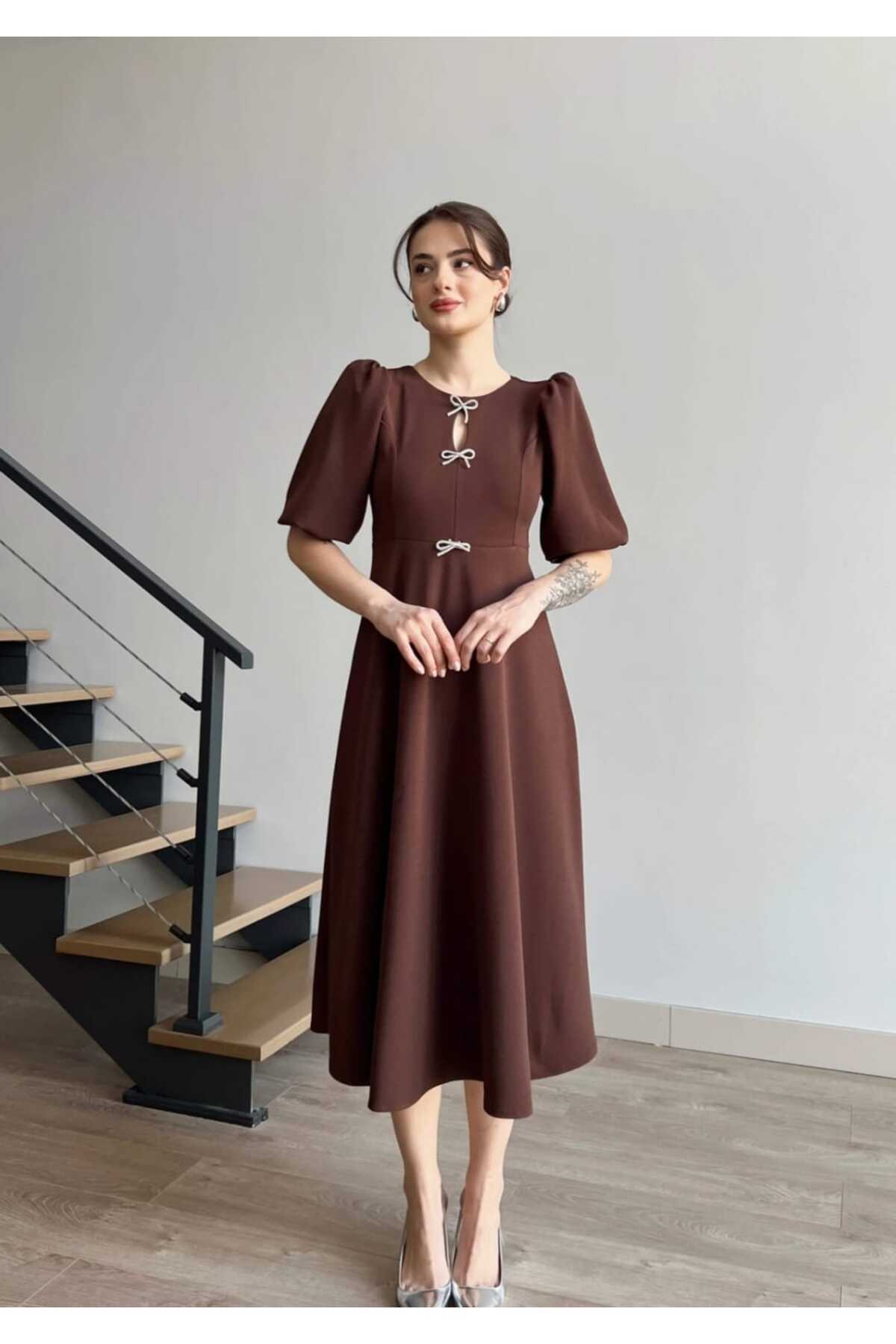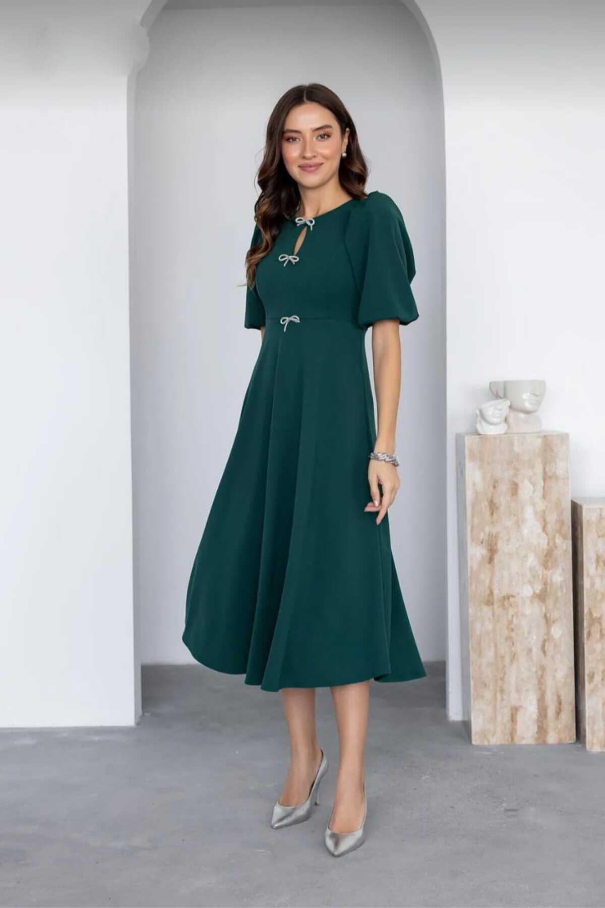 Kadın Üç Fiyonklu Broş Detay Krep Balon Kol Midi Boy Elbise Kadın Üç Fiyonklu Broş Detay Krep Balon Kol Midi Boy Elbise 5187864121 XL