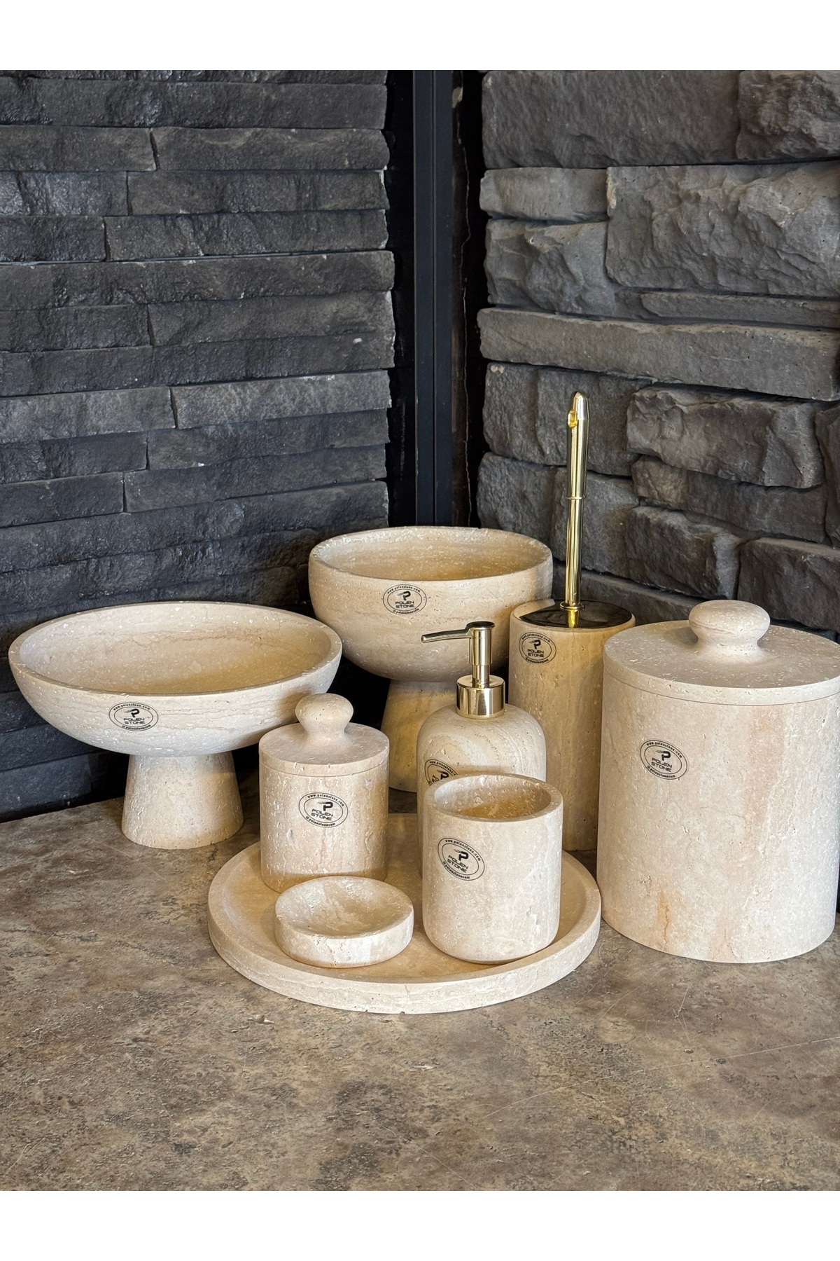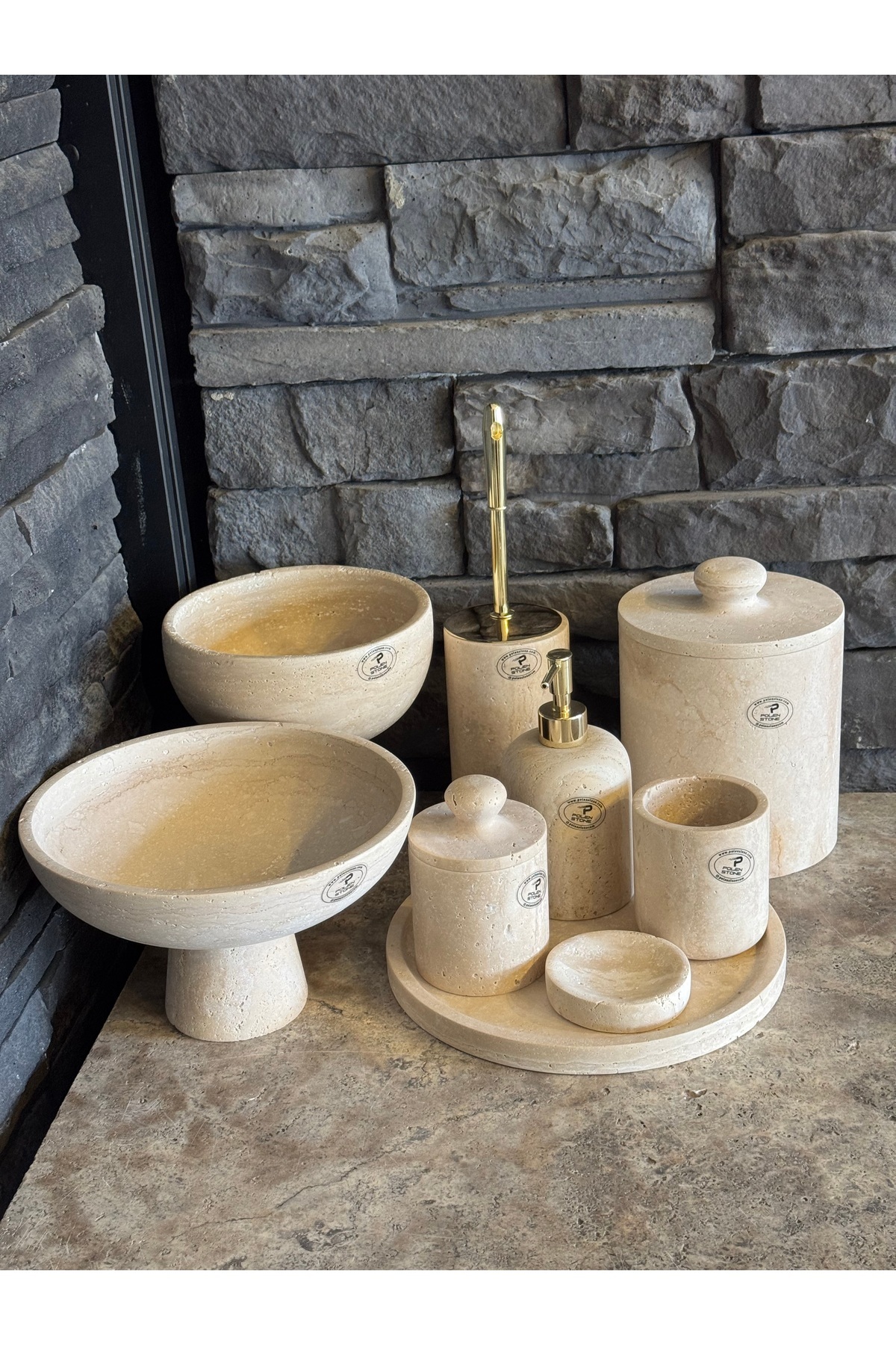 Traverten Doğal Taş 9 Parça Gold Detaylı Banyo Takımı Traverten Doğal Taş 9 Parça Gold Detaylı Banyo Takımı PLN1222 تک سایز