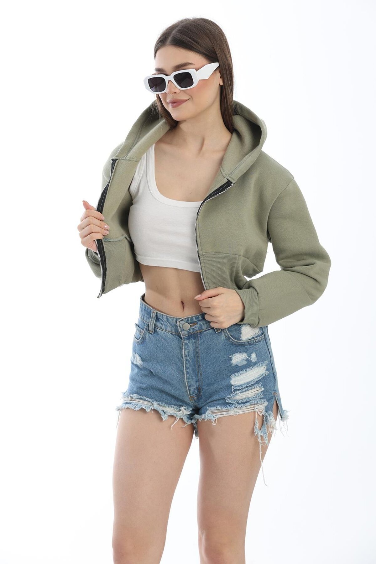 Bel Detaylı Fermuarlı Crop Sweatshirt Haki Bel Detaylı Fermuarlı Crop Sweatshirt Haki 250010SWT XL
