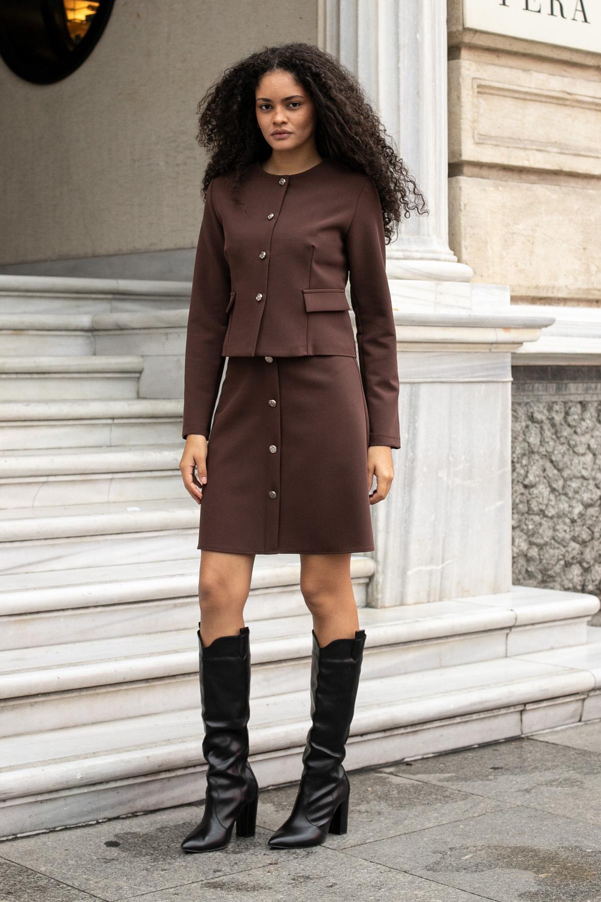 Likralı Kumaş Yakalı Flato Cep Kruvaze Şık Ofis Yelek(Etek ayrıdır kodu Jument 100116)-Koyu Taba Likralı Kumaş Yakalı Flato Cep Kruvaze Şık Ofis Yelek(Etek ayrıdır kodu Jument 100116)-Koyu Taba 65017 42