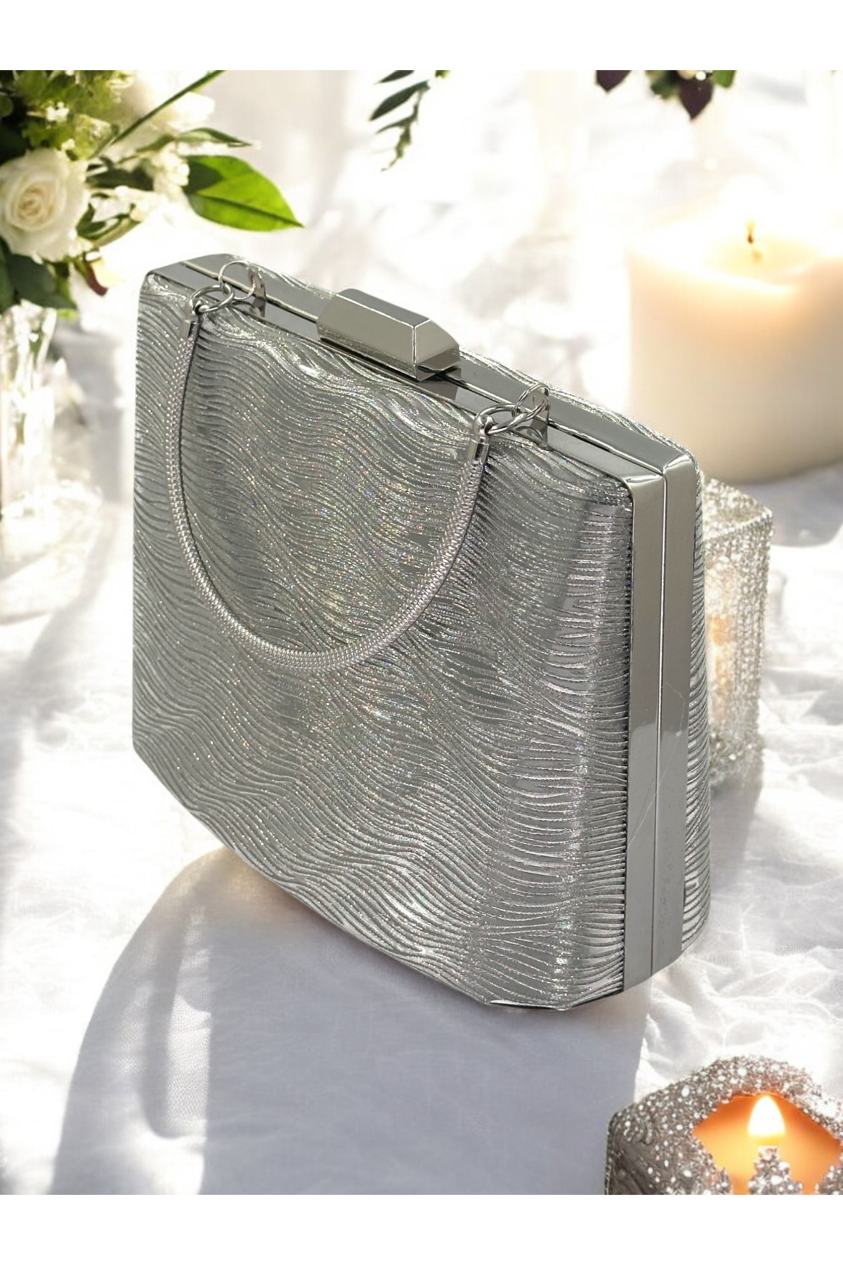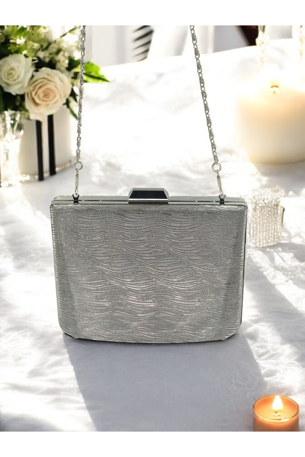 Antrasit Gri Platin Renk Lazer Desen Büyük Boy Metal Saplı Zincir Askılı Abiye Çanta Antrasit Gri Platin Renk Lazer Desen Büyük Boy Metal Saplı Zincir Askılı Abiye Çanta HK 571 Lazer Su yolu تک سایز