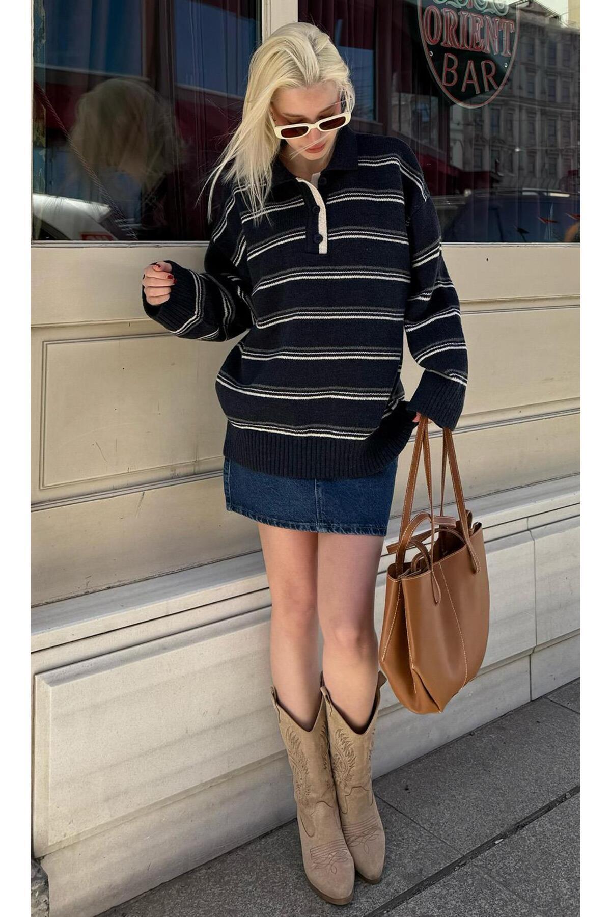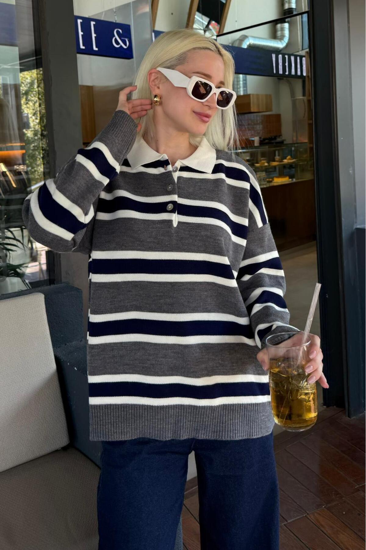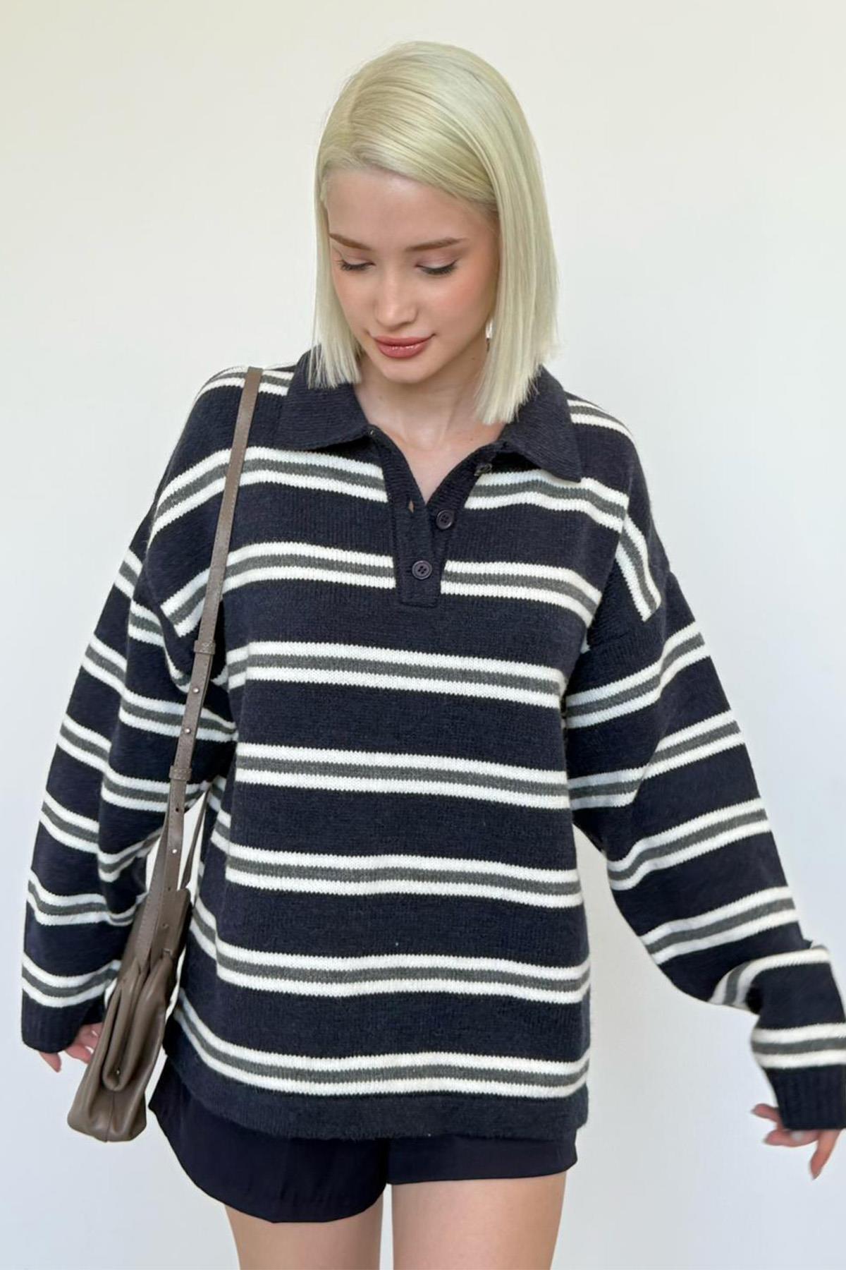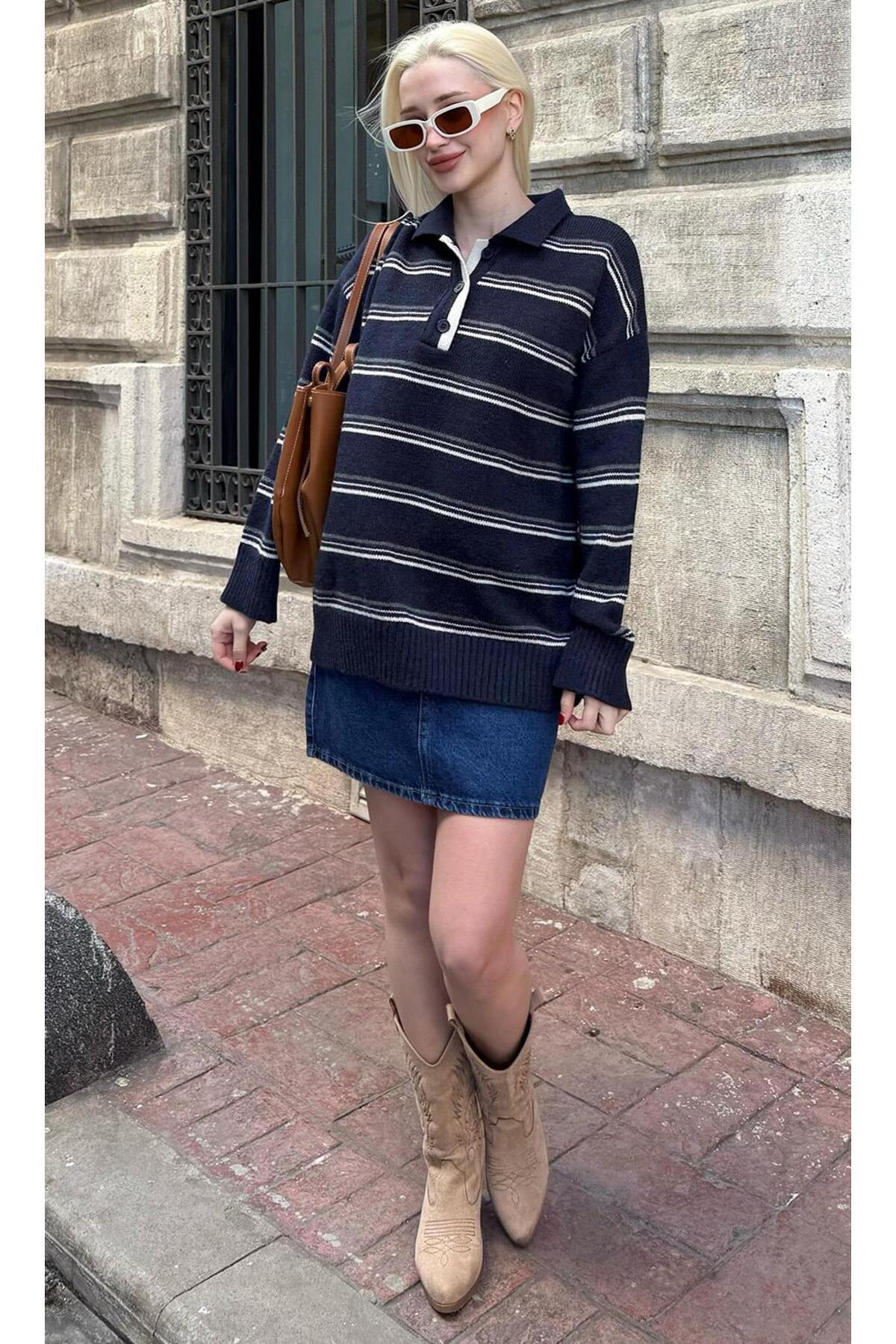 Lacivert Çizgili Düğmeli Polo Yaka Kazak Mg2357 Lacivert Çizgili Düğmeli Polo Yaka Kazak Mg2357 MG2357 L