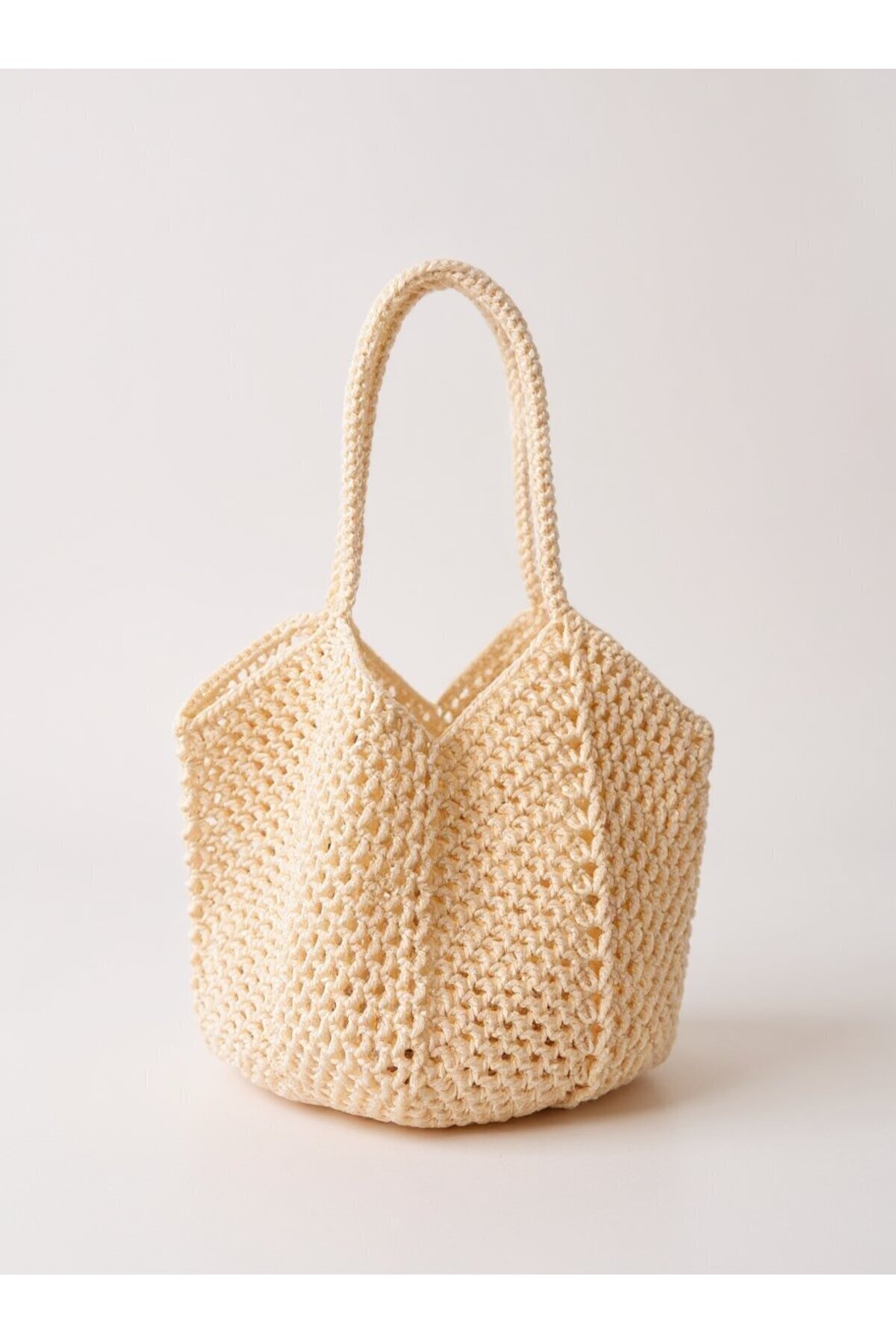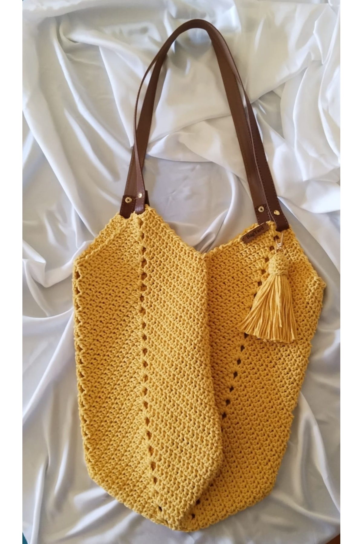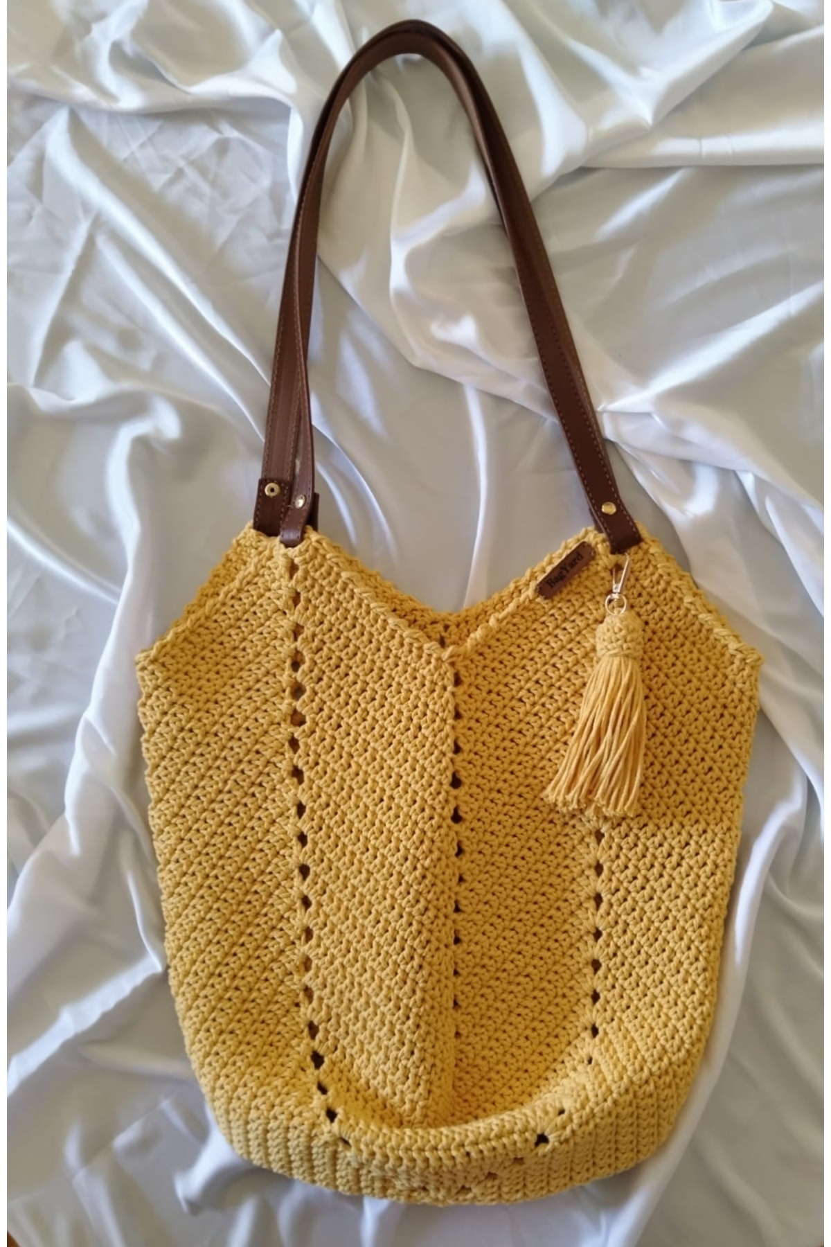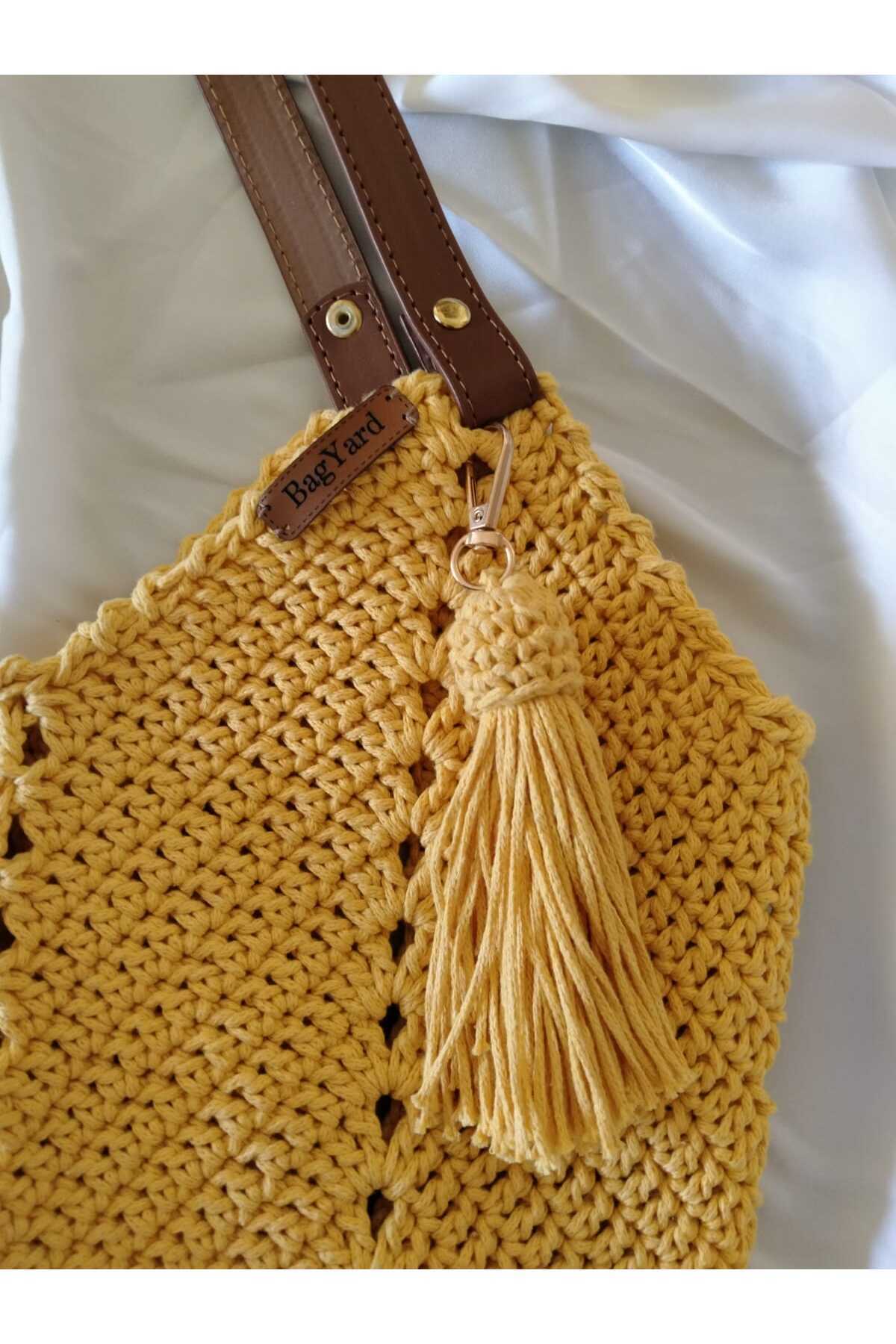 Pamuk Makrome El Yapımı Örgü Sarı Lale Model ve Kahverengi Deri Askılı Kadın Omuz Plaj Çantası Pamuk Makrome El Yapımı Örgü Sarı Lale Model ve Kahverengi Deri Askılı Kadın Omuz Plaj Çantası Orta Boy