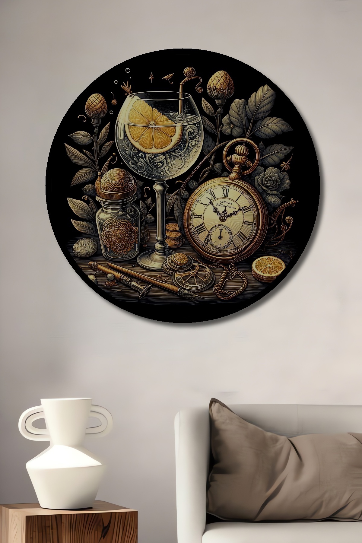 Vintage Saat ve Limonlu Kokteyl Dekoratif Ahşap MDF Yuvarlak Ev,İşyeri Duvar Tablo Vintage Saat ve Limonlu Kokteyl Dekoratif Ahşap MDF Yuvarlak Ev,İşyeri Duvar Tablo hmdtbl_1608_T 50 x 50