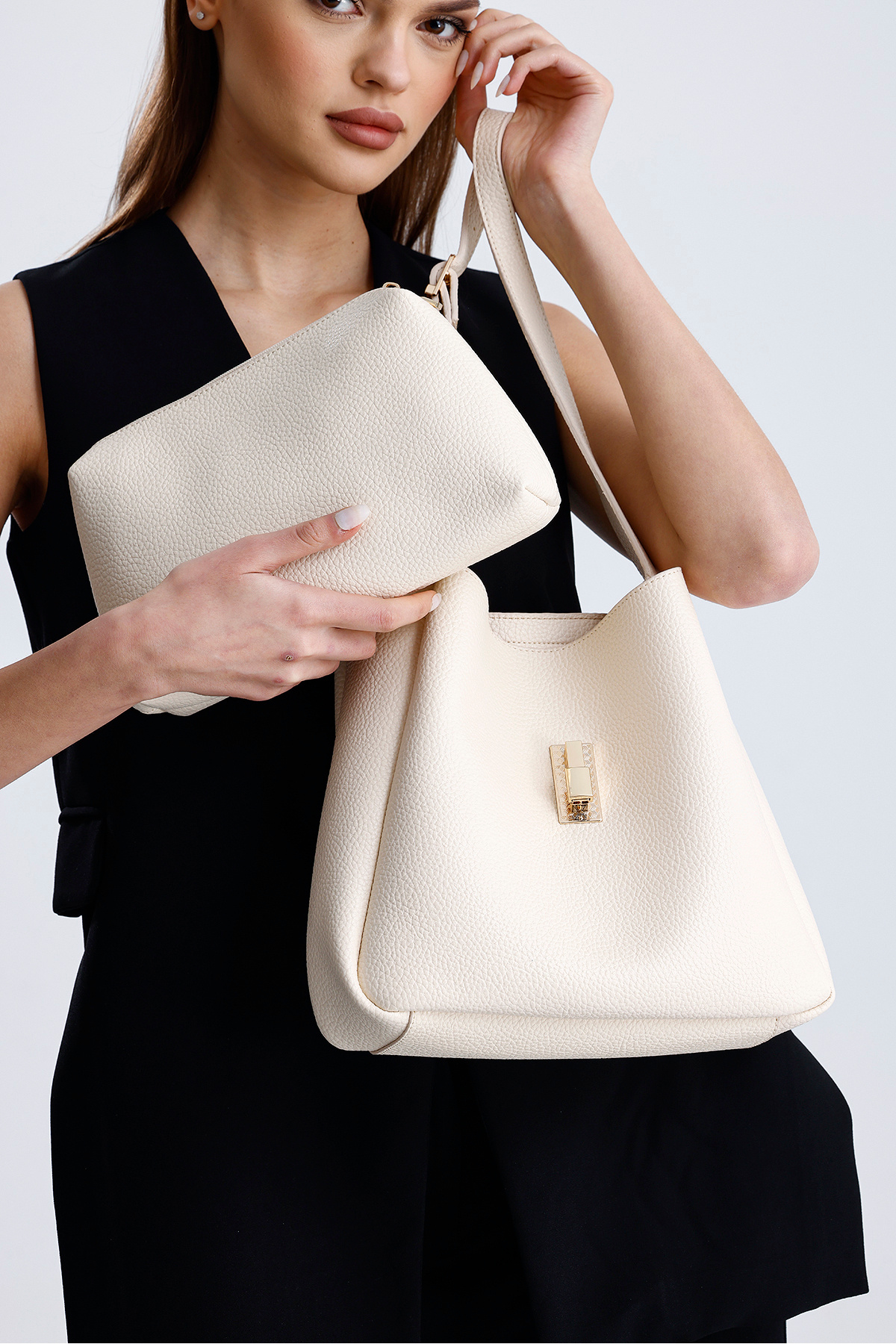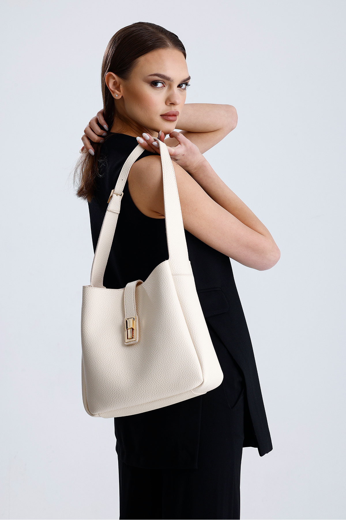 Krem Kilit Detaylı Yavru Çantalı Yumuşak Dokulu Kadın Omuz Çantası Krem Kilit Detaylı Yavru Çantalı Yumuşak Dokulu Kadın Omuz Çantası E-5922 Orta Boy