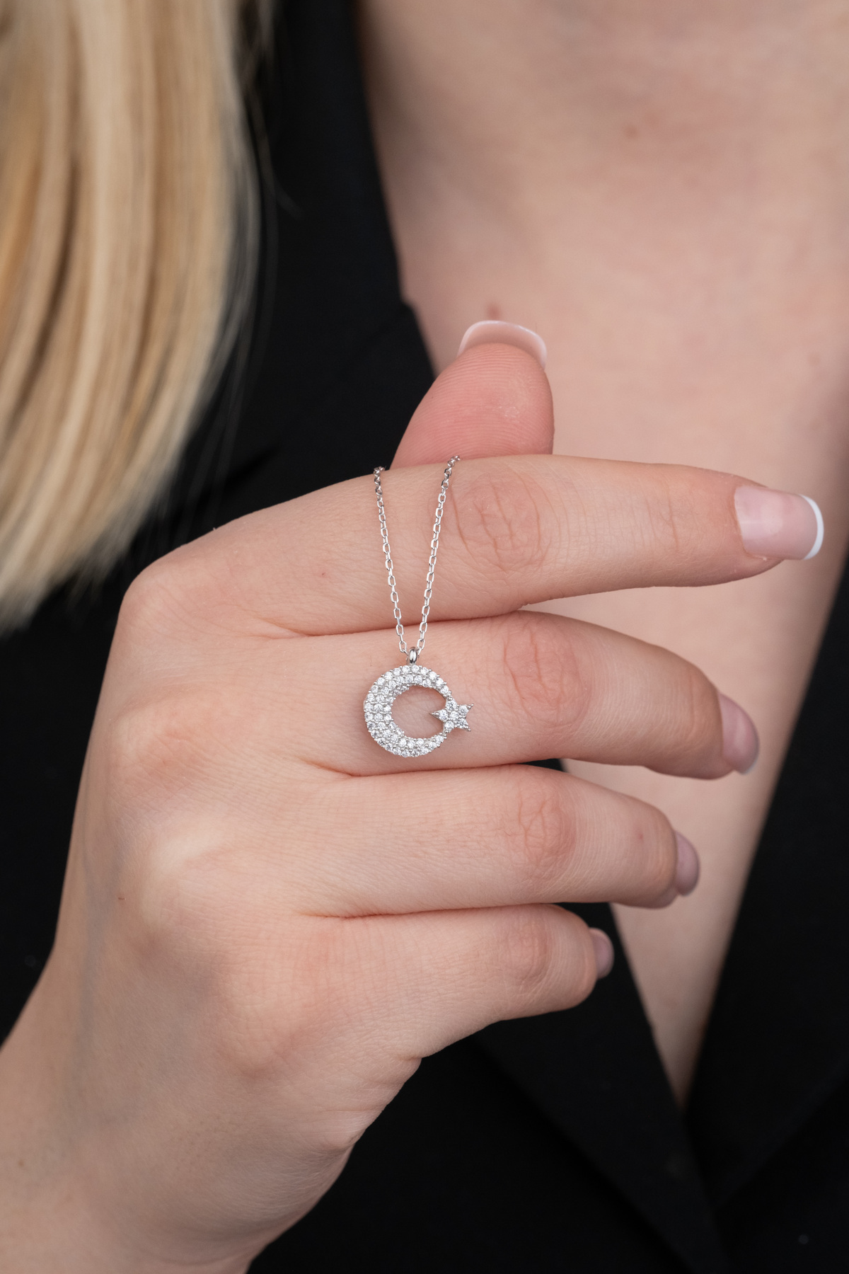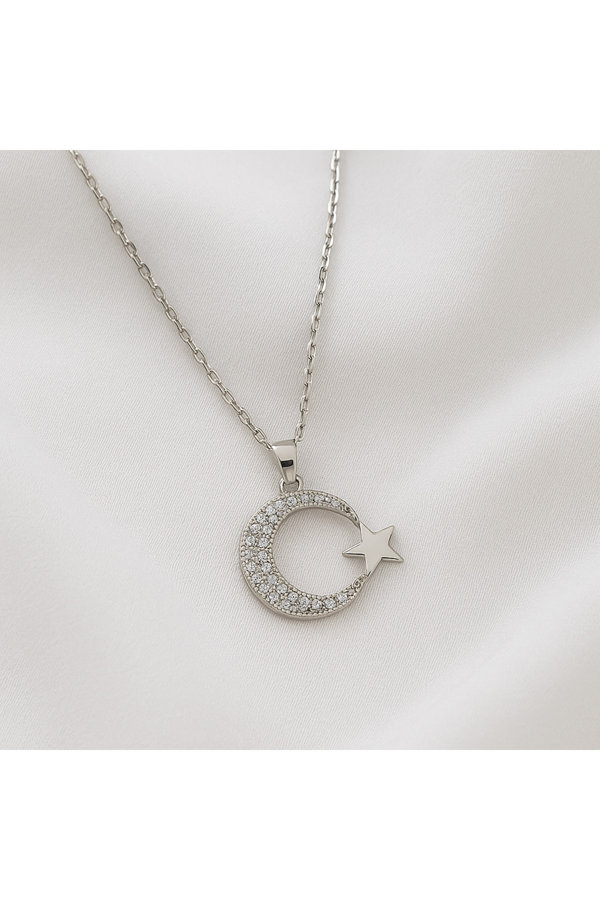 925 Ayar Gümüş Rodyumlu Zirkon Çok Taşlı Ay Yıldız Kolye 925 Ayar Gümüş Rodyumlu Zirkon Çok Taşlı Ay Yıldız Kolye GHSBK10003 تک سایز
