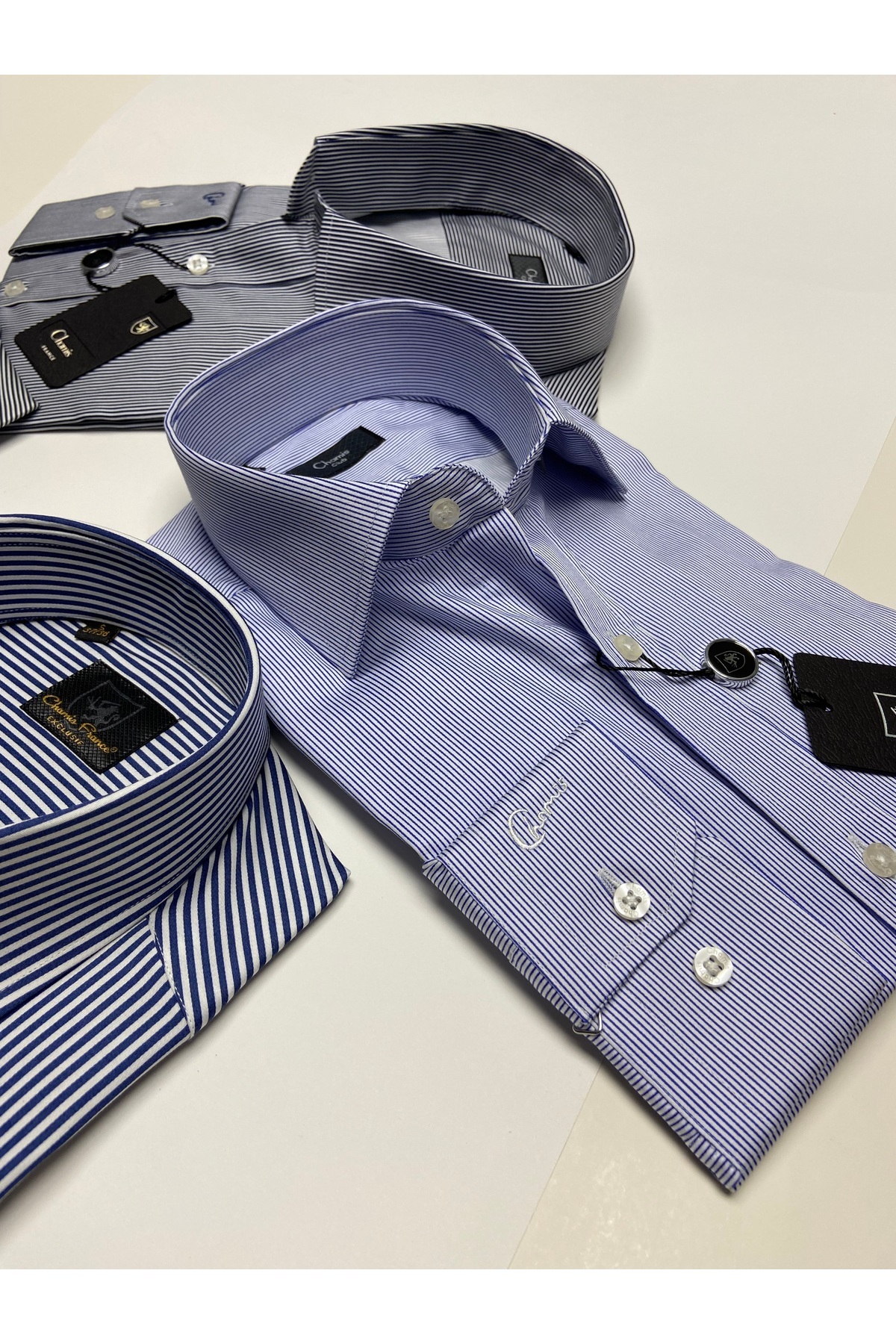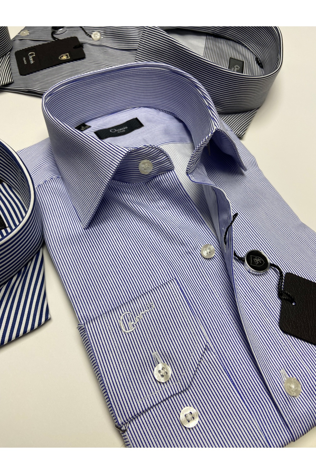 SlimFit Mavi İnce Çizgili Pamuk Saten Uzun Dik Yaka Gömlek SlimFit Mavi İnce Çizgili Pamuk Saten Uzun Dik Yaka Gömlek CH96093 XL
