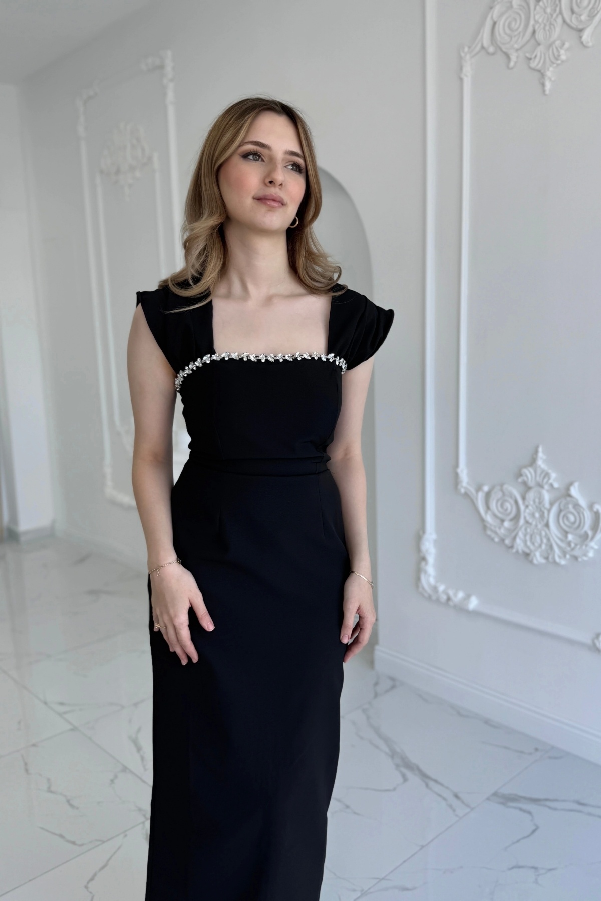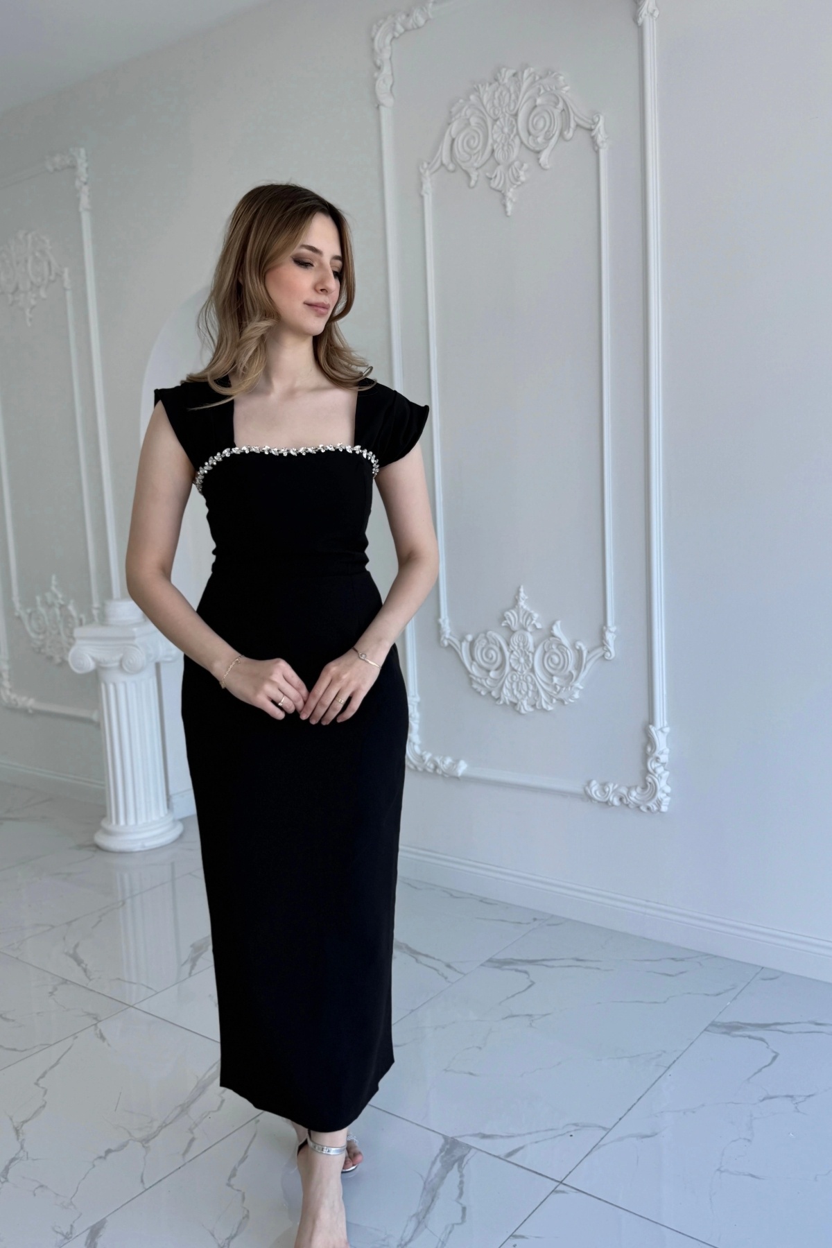 Siyah Maxi boy yaka taş detaylı uzun elbise Siyah Maxi boy yaka taş detaylı uzun elbise 1022 XL