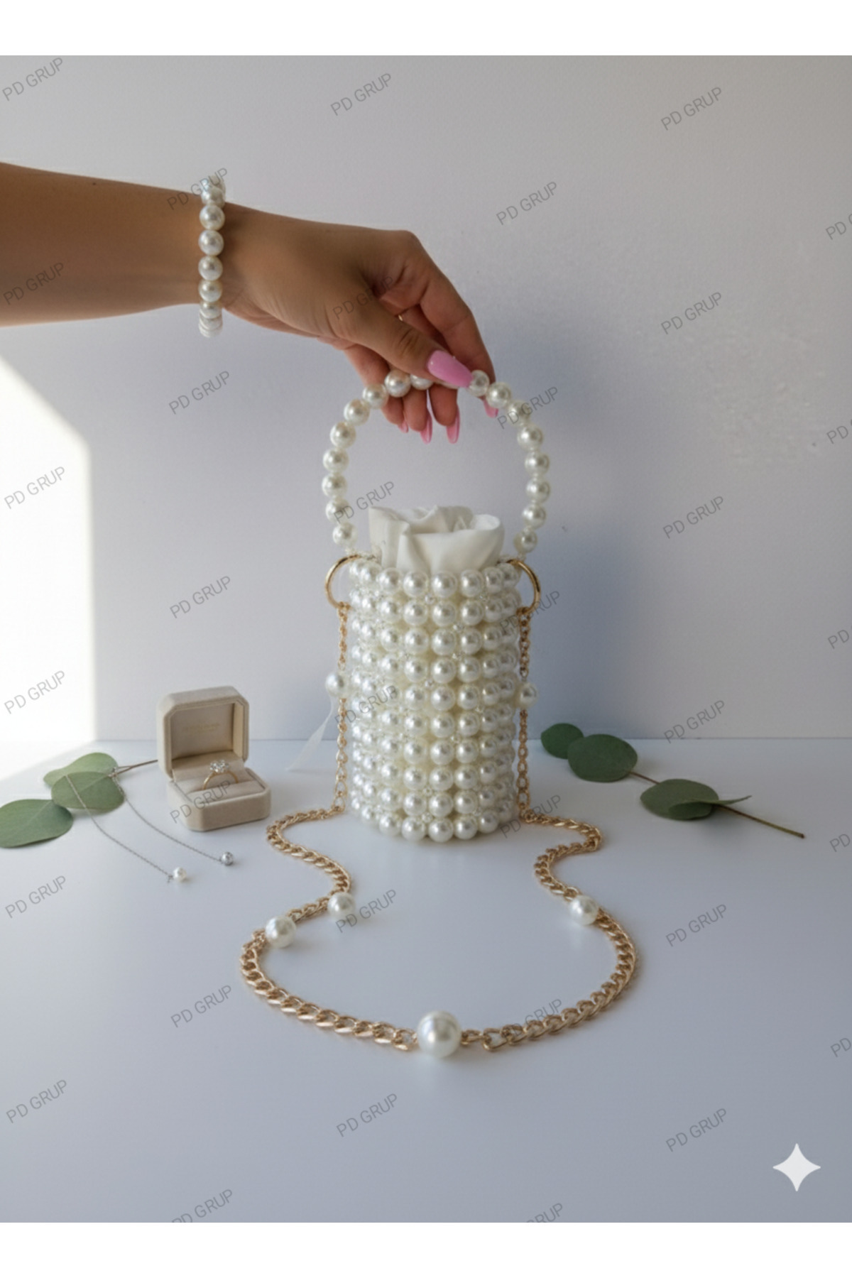 İnci silindir çanta astarlı İncili yuvarlak çanta inci kolye ve inci bileklik hediyeli İnci silindir çanta astarlı İncili yuvarlak çanta inci kolye ve inci bileklik hediyeli Slndr01 AA