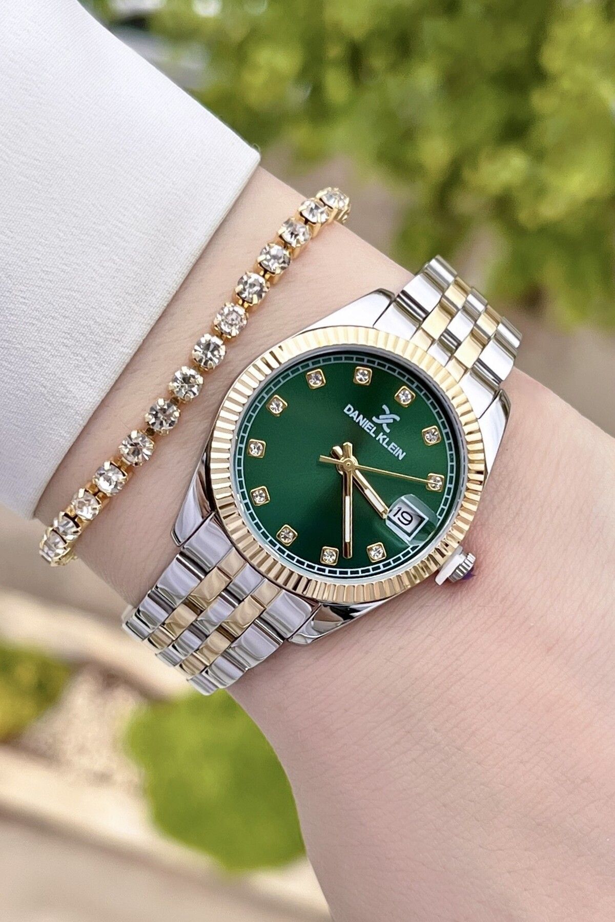 Kadranı Yeşil Kordonu Gold Gümüş Renk 28 Mm Kadın Kol Saati Ve Bielklik Kadranı Yeşil Kordonu Gold Gümüş Renk 28 Mm Kadın Kol Saati Ve Bielklik DKISTE310022A تک سایز