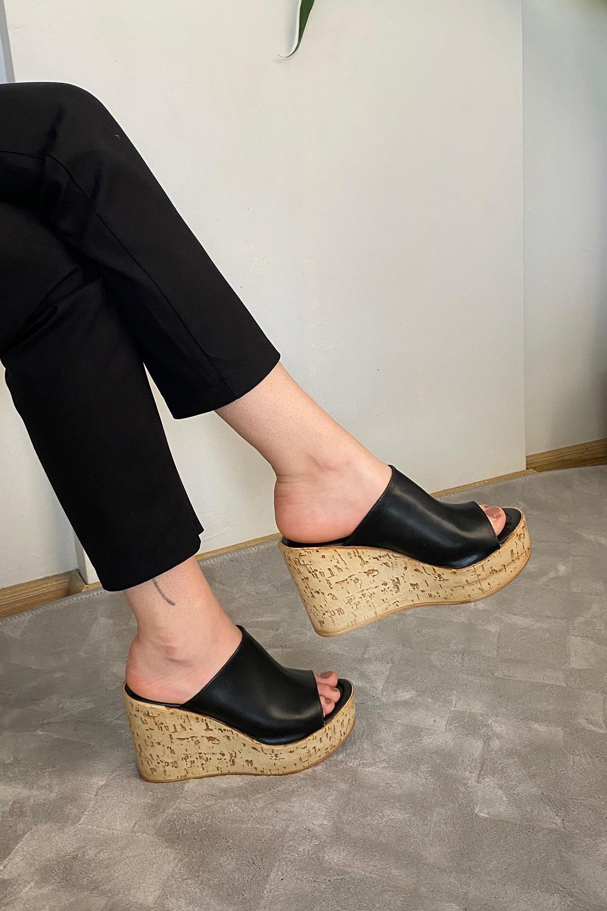 Kadın Holi Siyah Cilt 10 cm Tolgulu Mantar Taban Terlik K-920 Kadın Holi Siyah Cilt 10 cm Tolgulu Mantar Taban Terlik K-920 25SHOLİ920 40