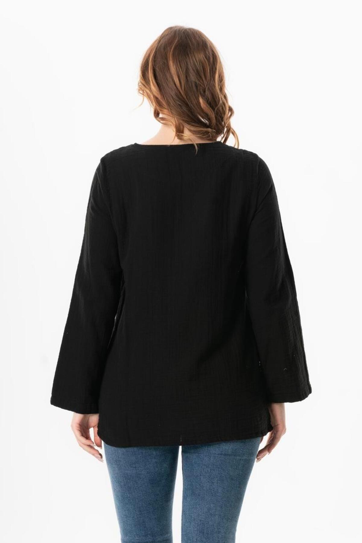 Uzun Kol Çiçek V Yaka Nakışlı Müslin Yazlık Bluz Siyah Syh Uzun Kol Çiçek V Yaka Nakışlı Müslin Yazlık Bluz Siyah Syh 512.09 4XL-5XL