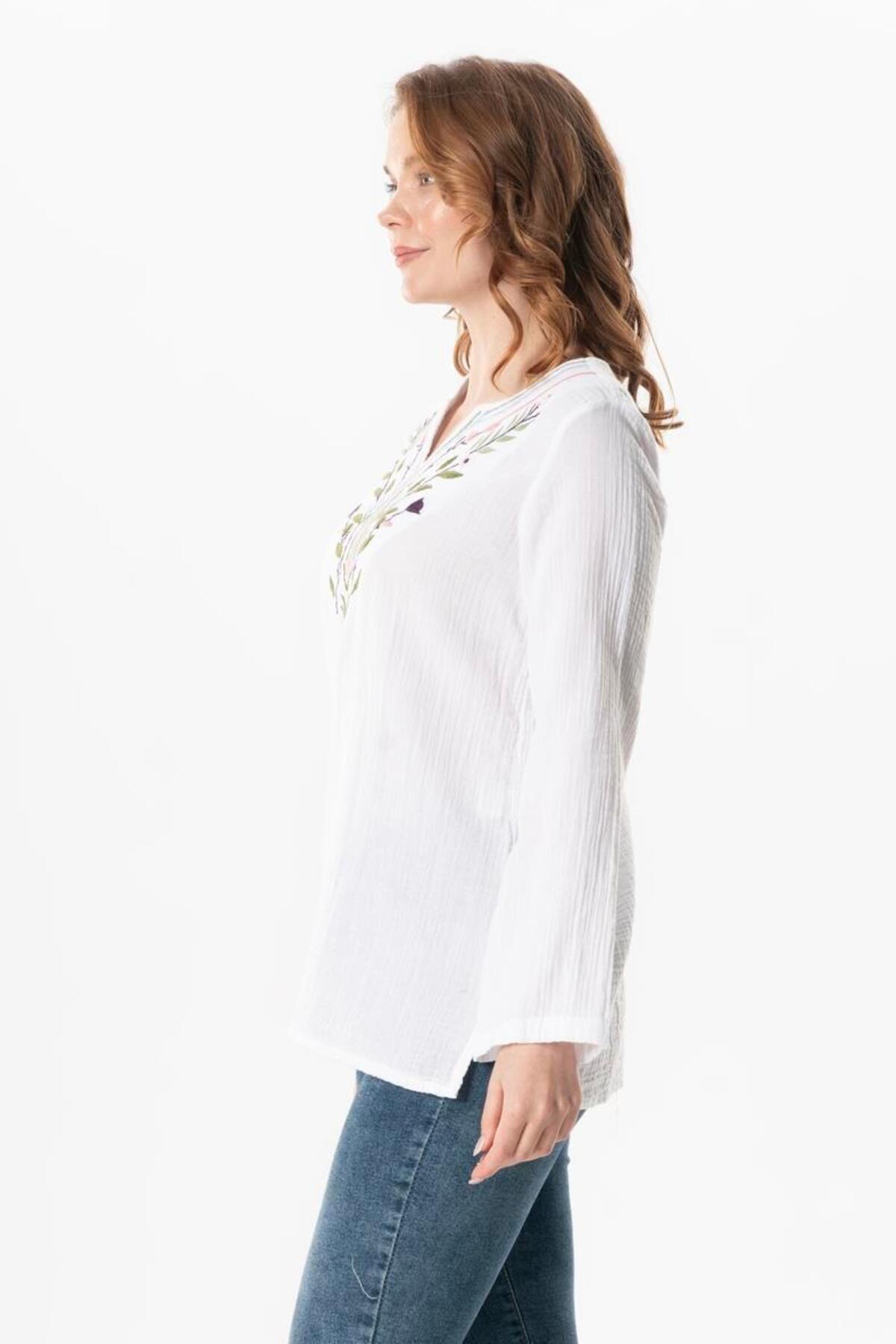 Uzun Kol Çiçek V Yaka Nakışlı Müslin Yazlık Bluz Beyaz Byz Uzun Kol Çiçek V Yaka Nakışlı Müslin Yazlık Bluz Beyaz Byz 512.09 4XL-5XL