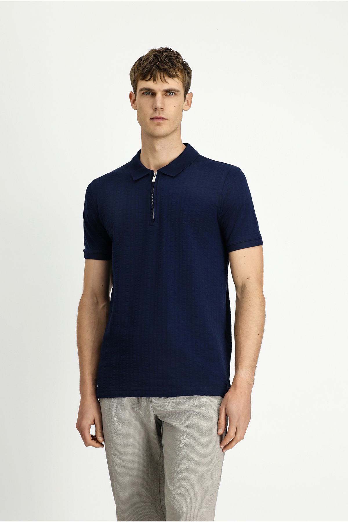 مشخصات فنی Slim Fit Dar Kesim Pamuk Desenli Fermuarlı Polo Yaka Tişört