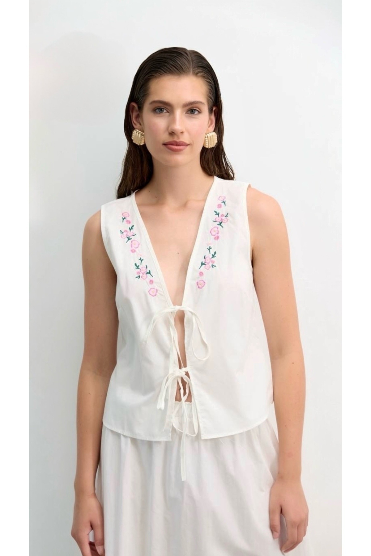 Kadın Ekru Nakışlı Bağlama Detaylı Zarif Yelek Kadın Ekru Nakışlı Bağlama Detaylı Zarif Yelek BGKRUNAKDETYLEK L