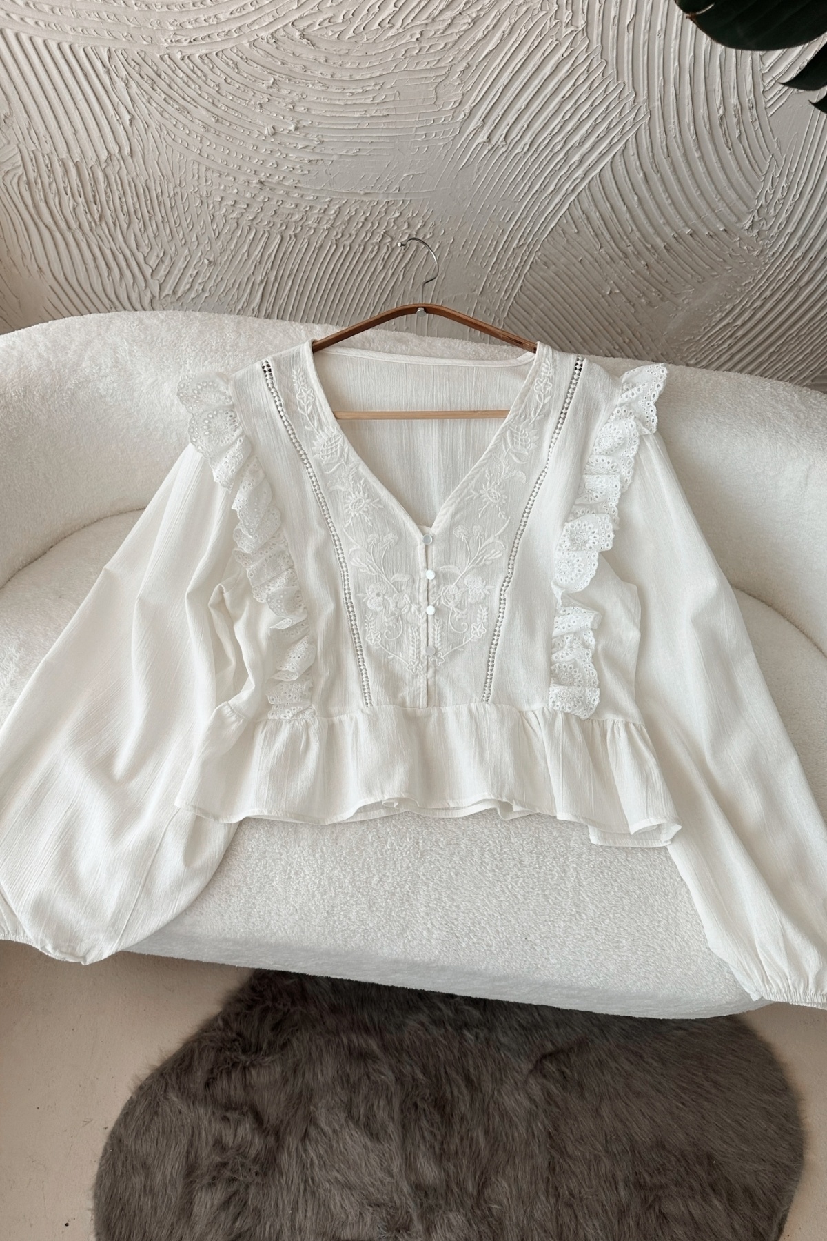 Kadın Kemik Dantel Şeritli Fırfırlı Keten Bluz CR00468 Kadın Kemik Dantel Şeritli Fırfırlı Keten Bluz CR00468 40