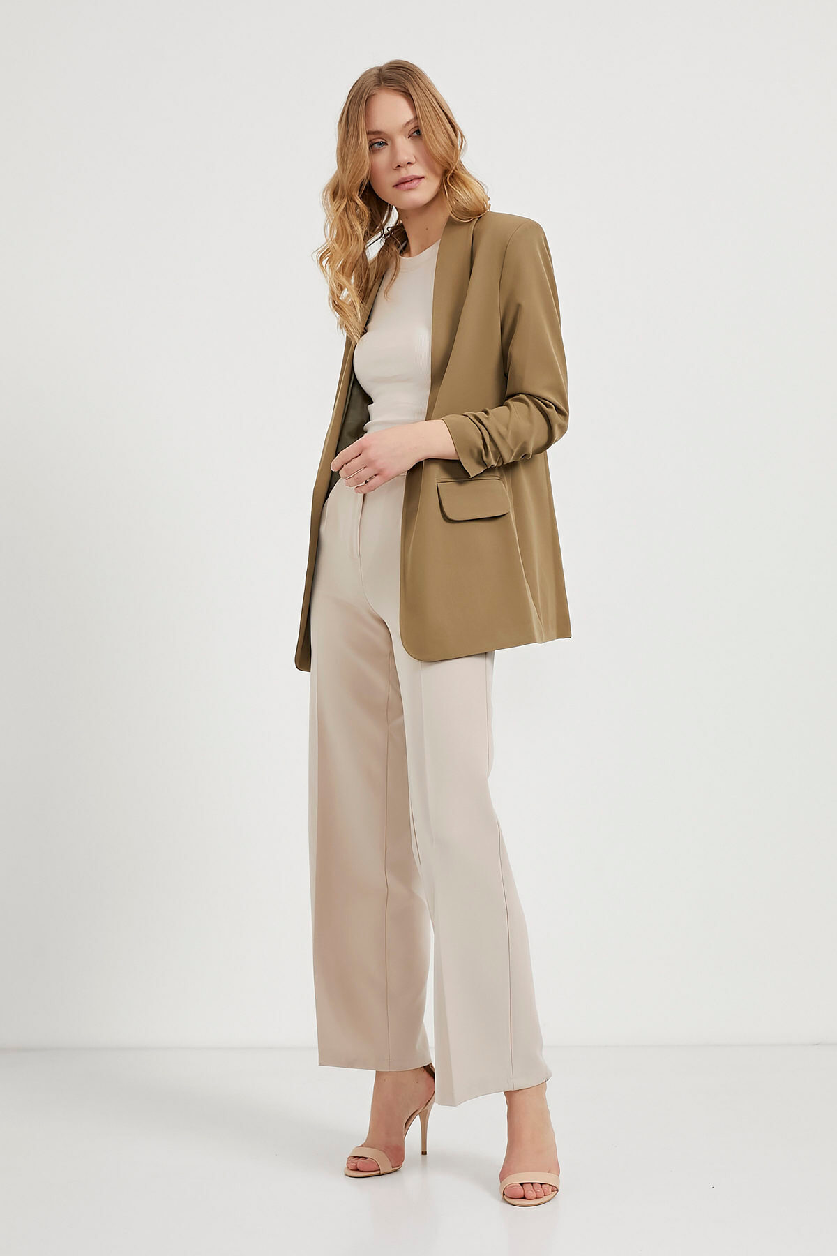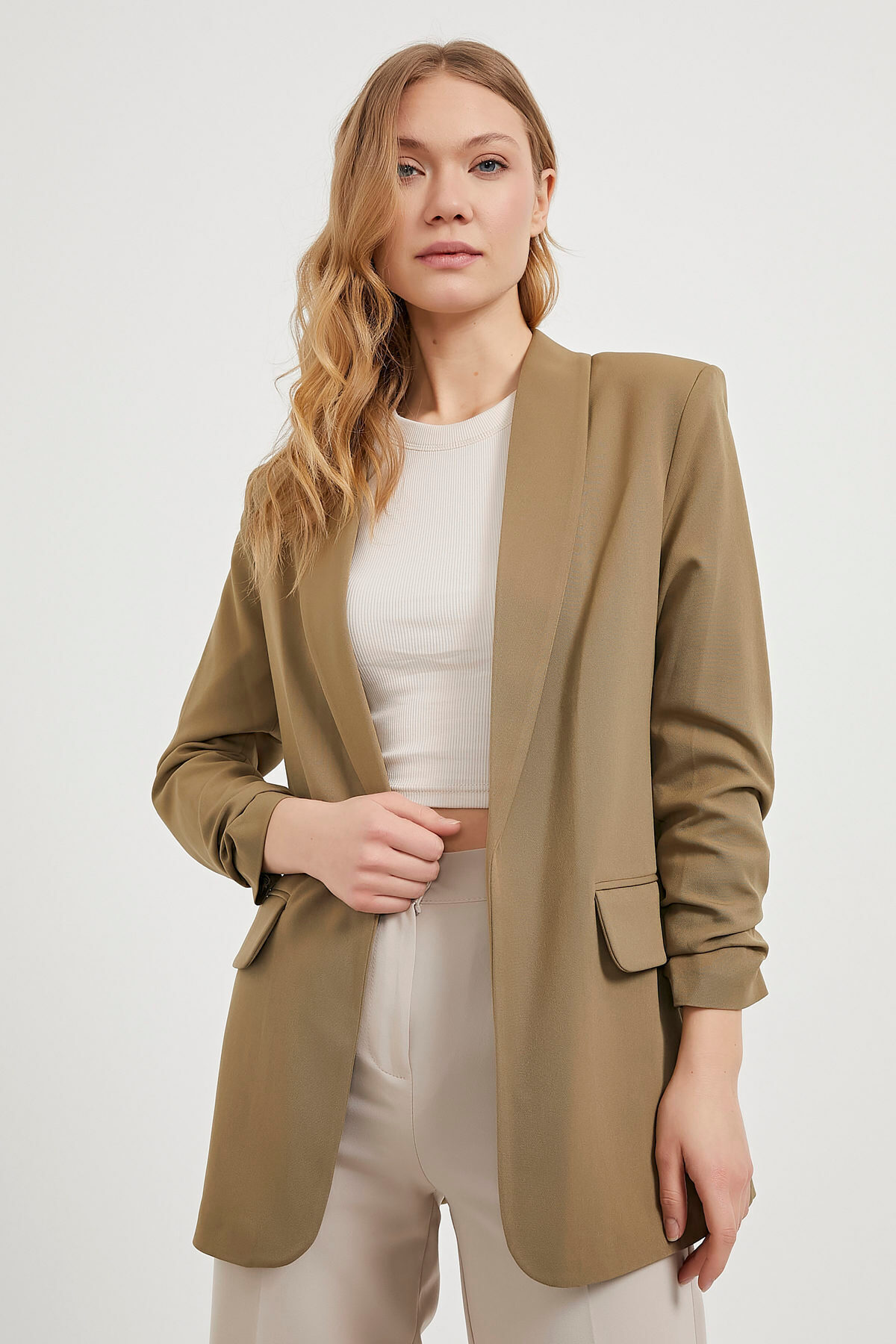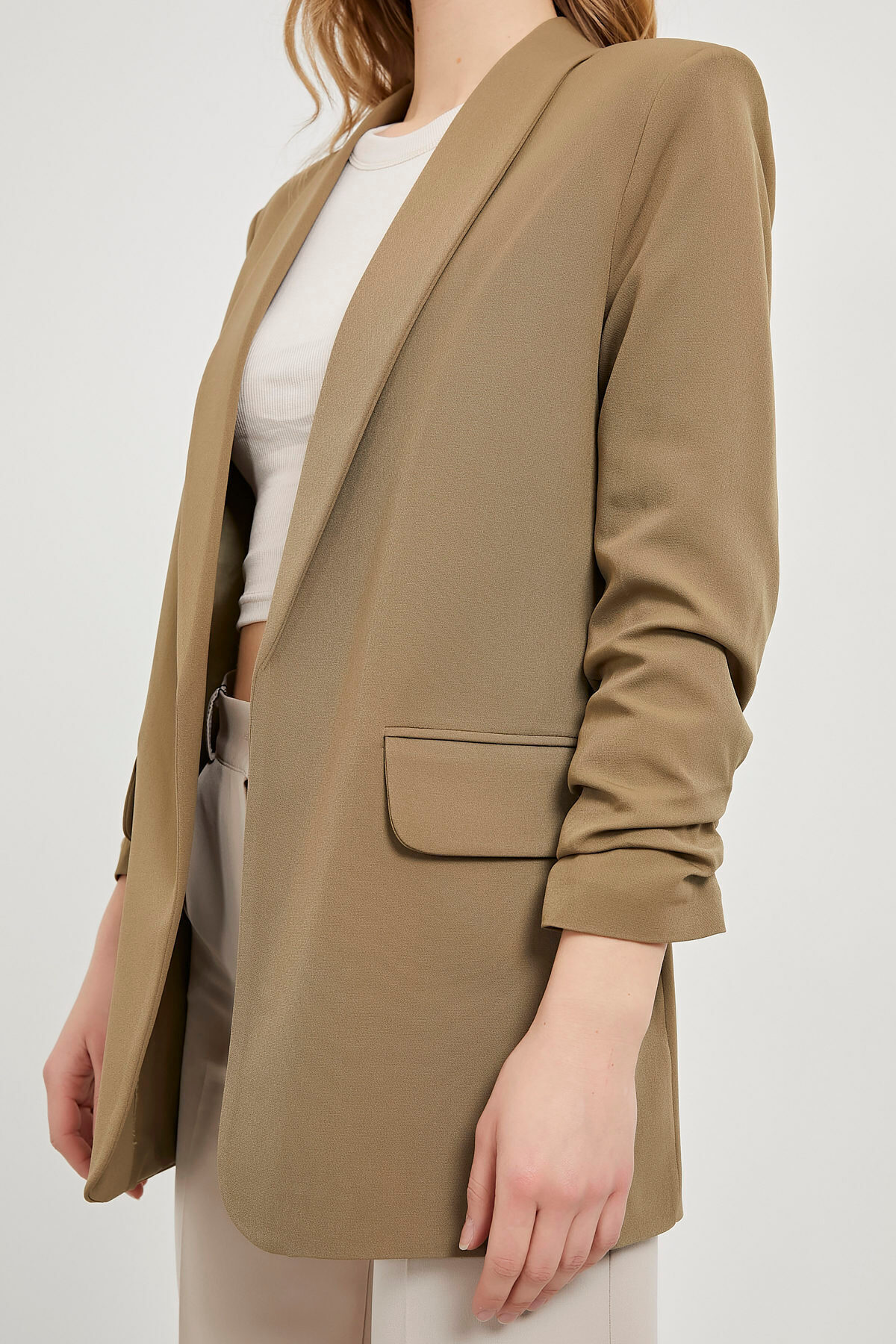 Kadın Mevsimlik Kolu Büzgülü Haki Blazer Ceket Kadın Mevsimlik Kolu Büzgülü Haki Blazer Ceket 594-5YB3101CKT XL