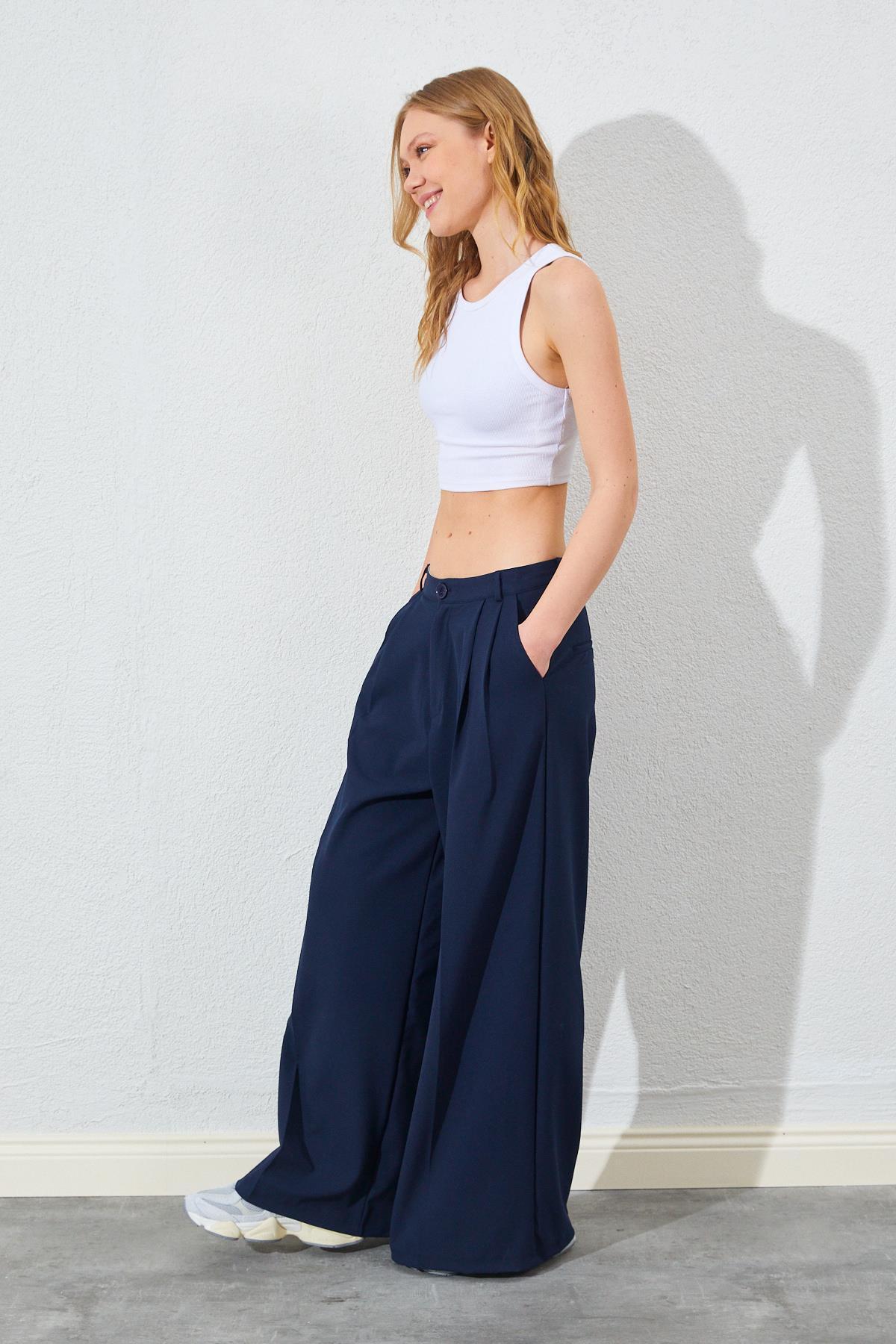 Kadın Lacivert Çift Pileli Bol Kesim Poliviskon Pantolon Kadın Lacivert Çift Pileli Bol Kesim Poliviskon Pantolon 5YKPNTN2522 L