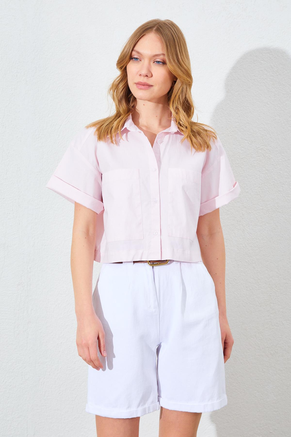 Kadın Toz Pembe Çift Cepli Düşük Kol Crop Gömlek Kadın Toz Pembe Çift Cepli Düşük Kol Crop Gömlek 5YKG16-1448 L