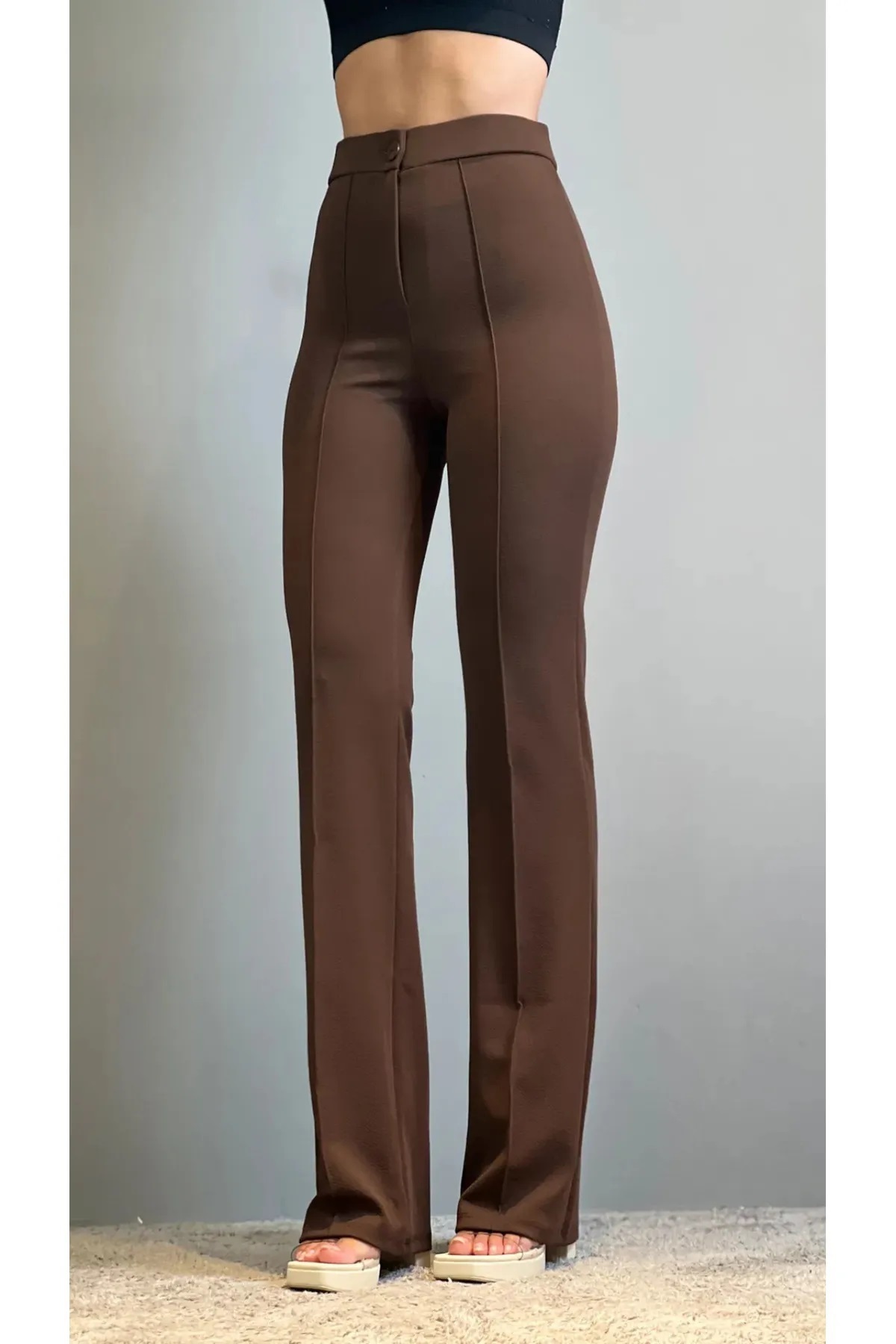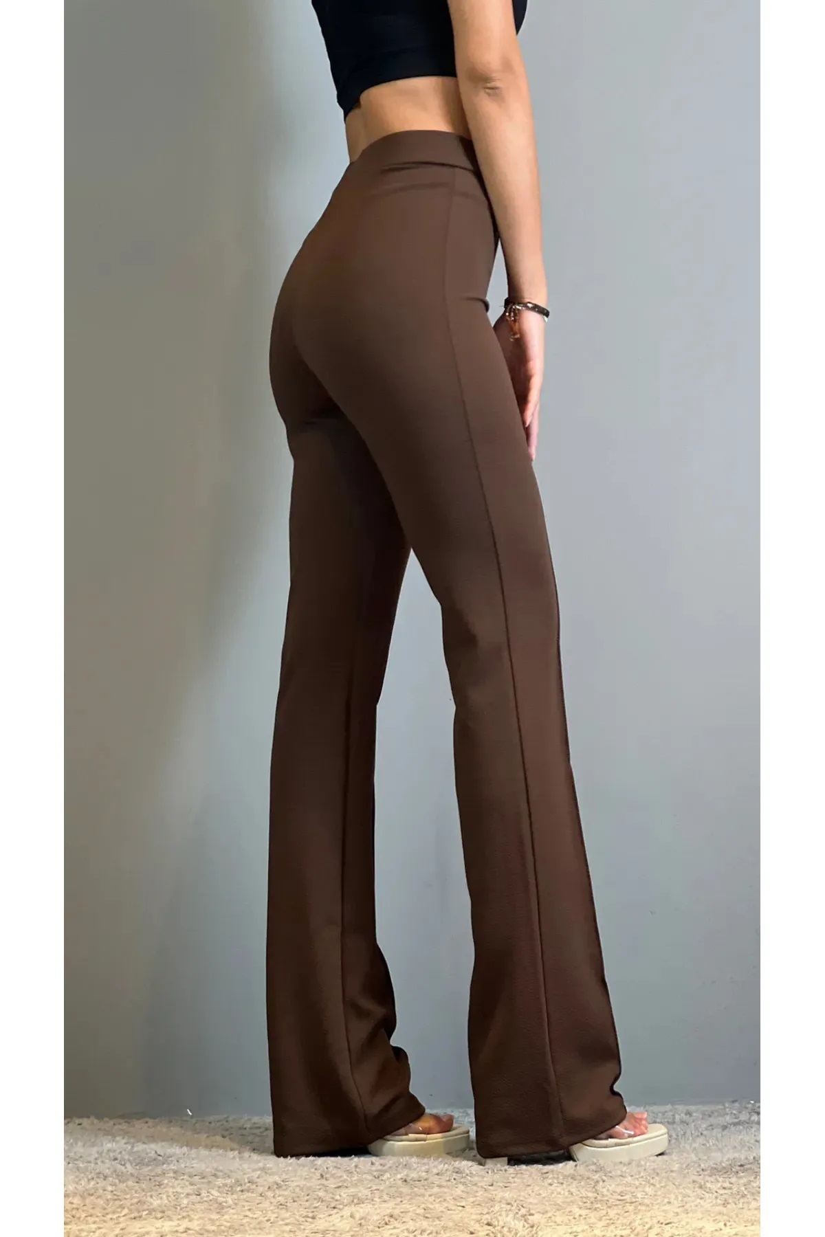 Likralı Çımalı Palazzo Pantolon - Kahverengi Likralı Çımalı Palazzo Pantolon - Kahverengi MN00099 XL