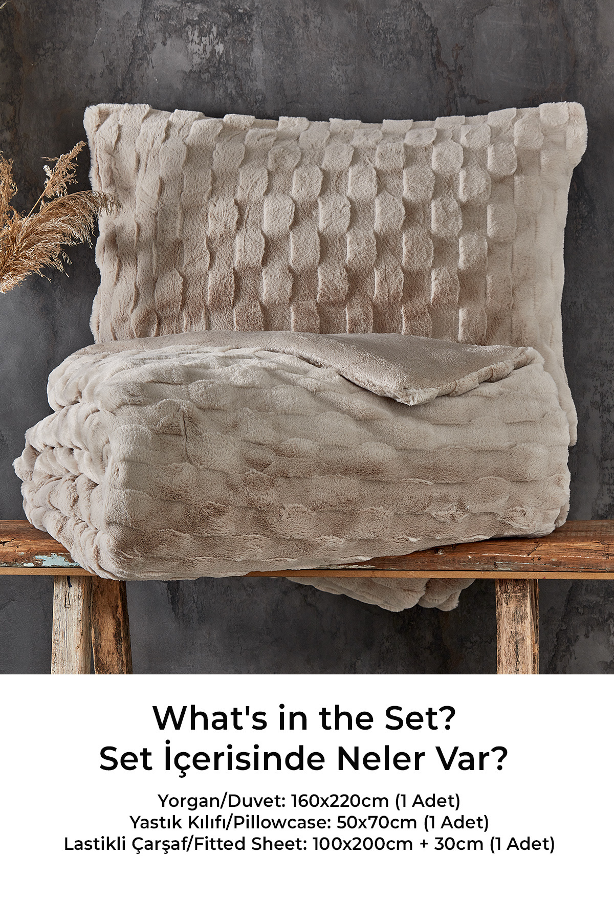 Kürk Yatak Örtüsü Yorgan Uyku Seti Tek Kişilik Çarşaflı Peluş Yumuşak Dolgulu Rody 3 Parça Bej Kürk Yatak Örtüsü Yorgan Uyku Seti Tek Kişilik Çarşaflı Peluş Yumuşak Dolgulu Rody 3 Parça Bej Q-YRG-91544 تک سایز