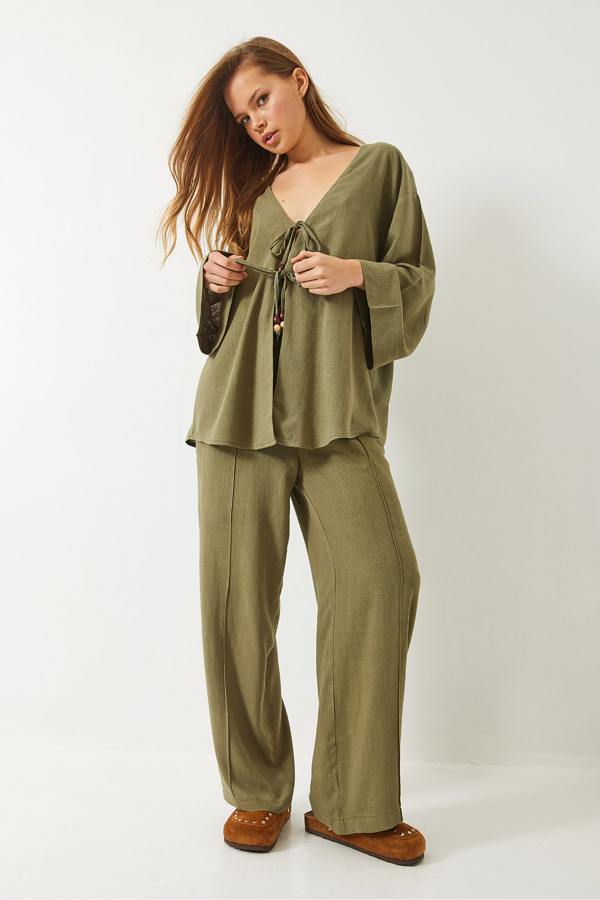 Kadın Önden Bağlamalı Boncuk Detaylı Keten Alt-Üst Takım 9262 60281010 Kadın Önden Bağlamalı Boncuk Detaylı Keten Alt-Üst Takım 9262 60281010 40