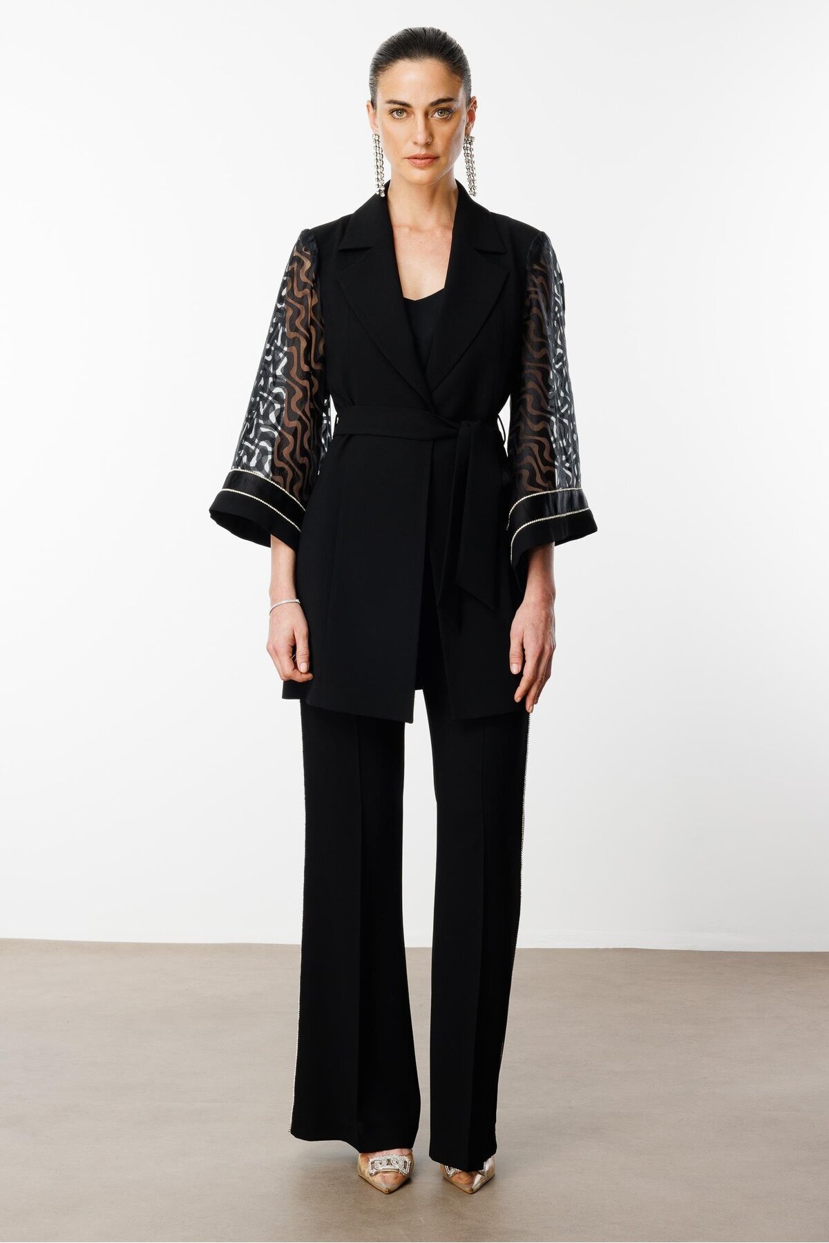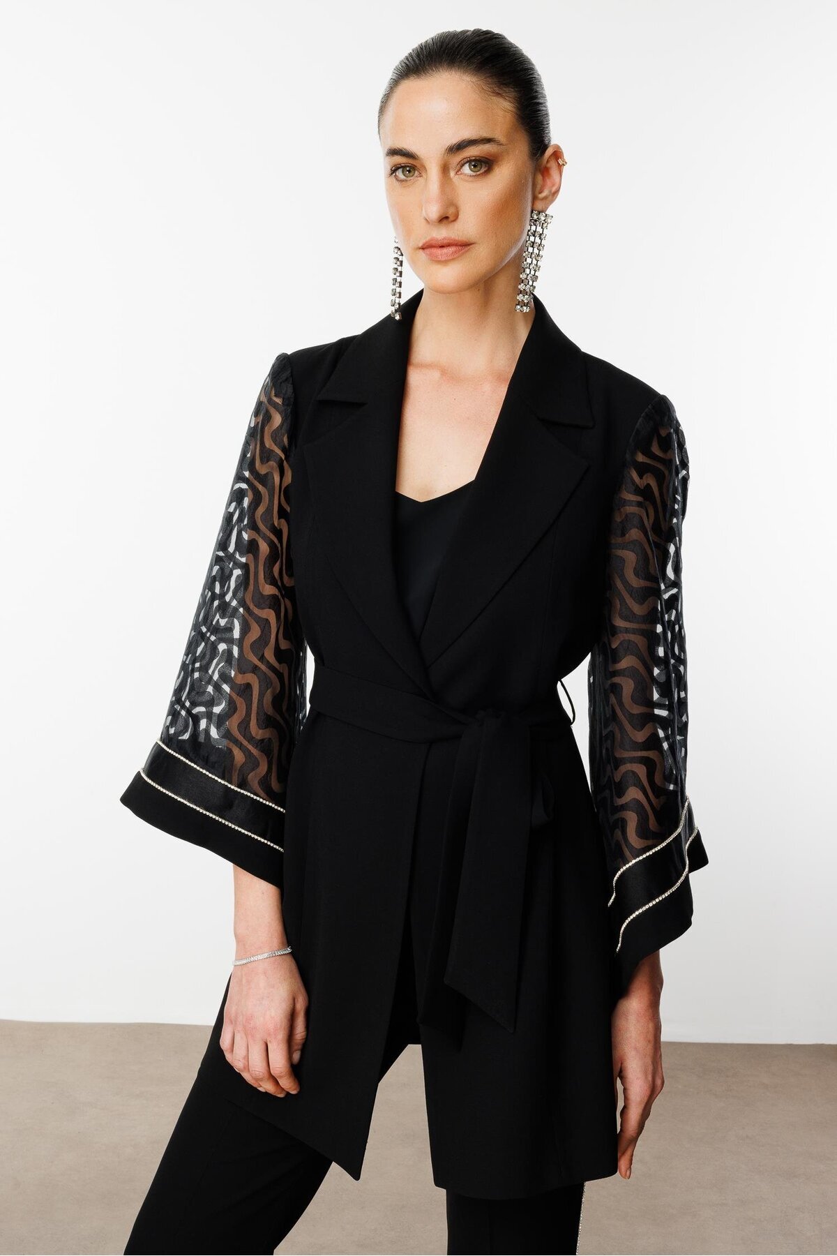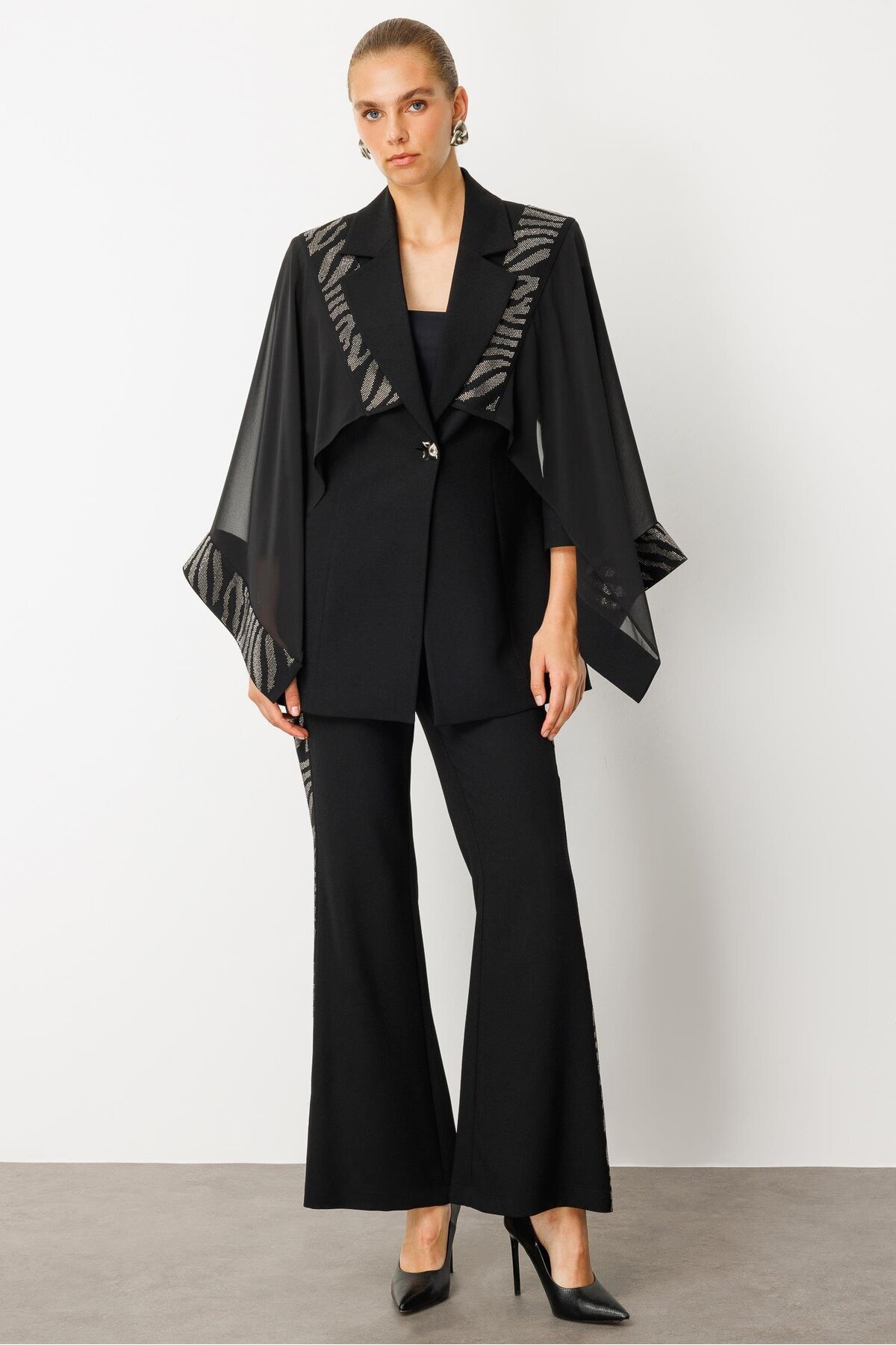 Modailgi Evaze Kol Şerit Taş Aksesuarlı Uzun Ceket Siyah Modailgi Evaze Kol Şerit Taş Aksesuarlı Uzun Ceket Siyah ILG251CKT70027 46