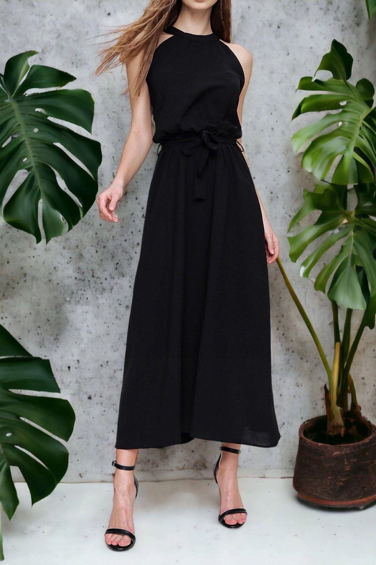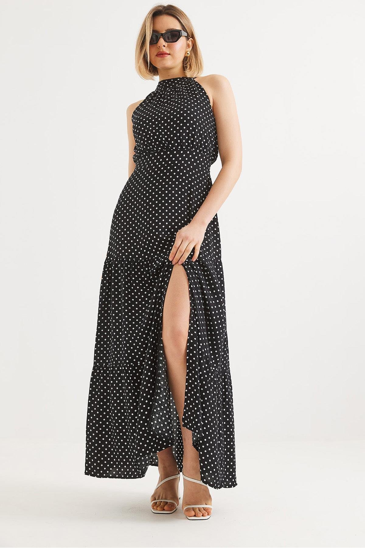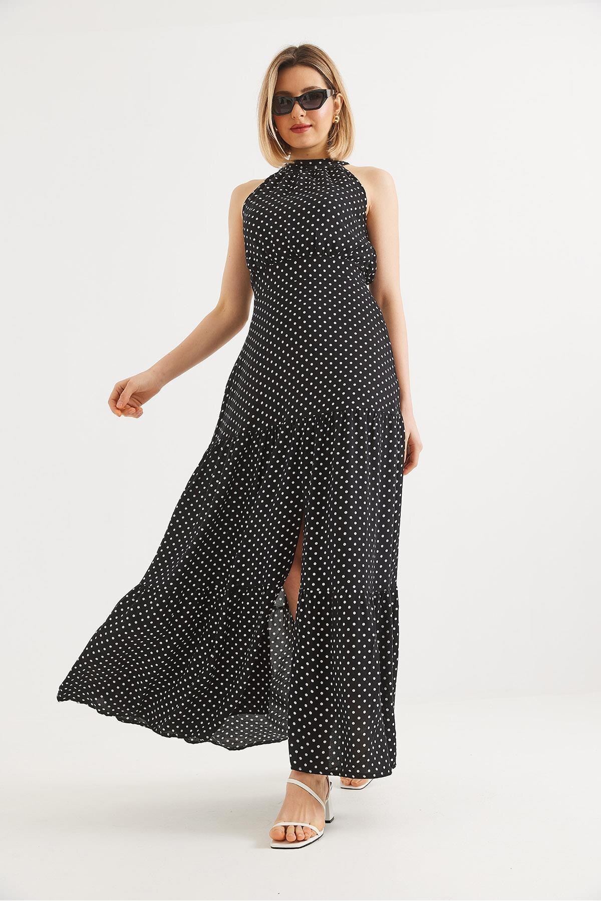 Yırtmaçlı Beli Bağlamalı Benek Desen Elbise Siyah Yırtmaçlı Beli Bağlamalı Benek Desen Elbise Siyah 250488ELB XL
