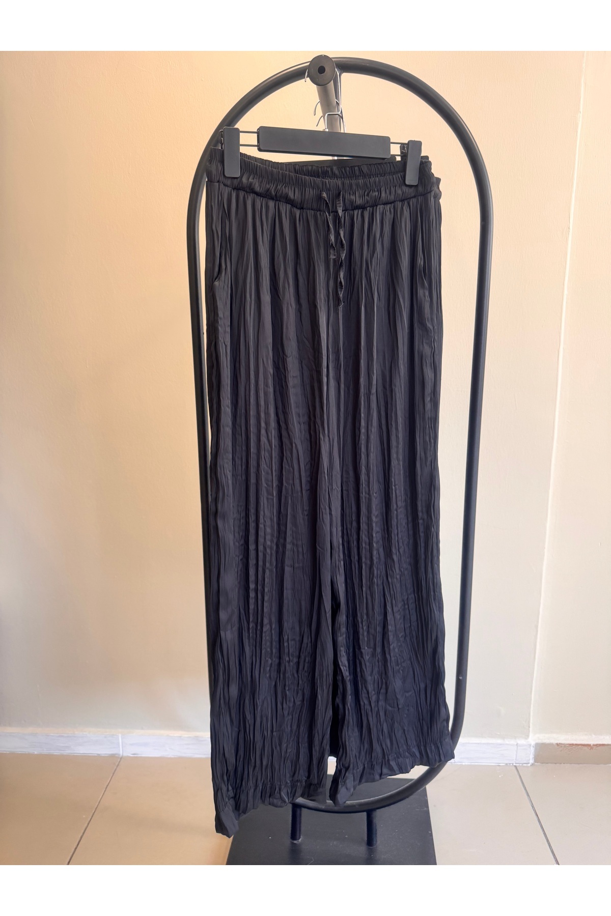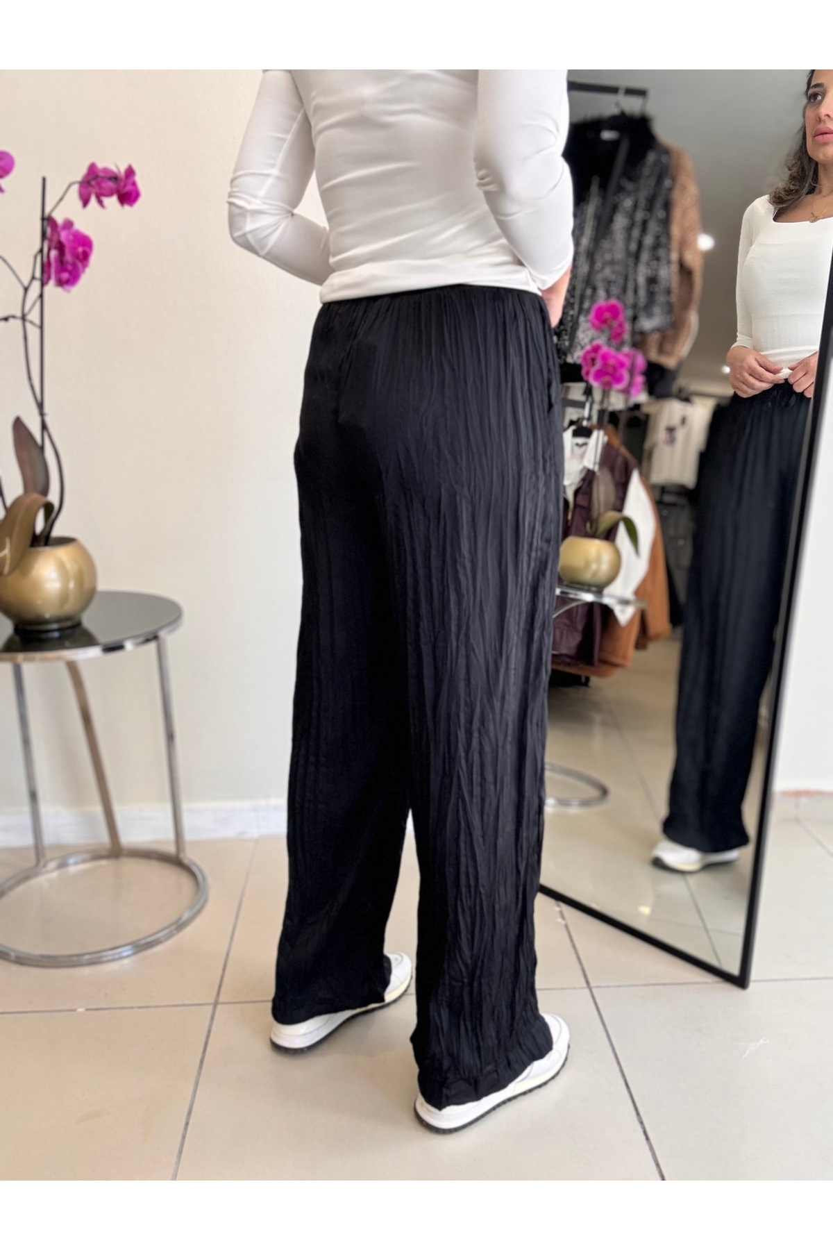 Kırışık Saten İnce Lastikli Yazlık Siyah Pantolon Kırışık Saten İnce Lastikli Yazlık Siyah Pantolon 2025PNTLN01 Standart