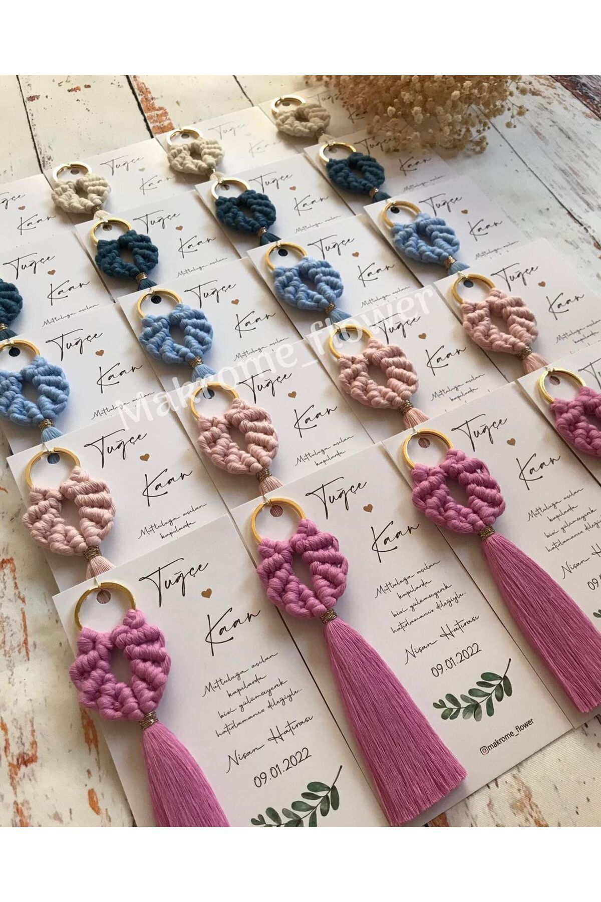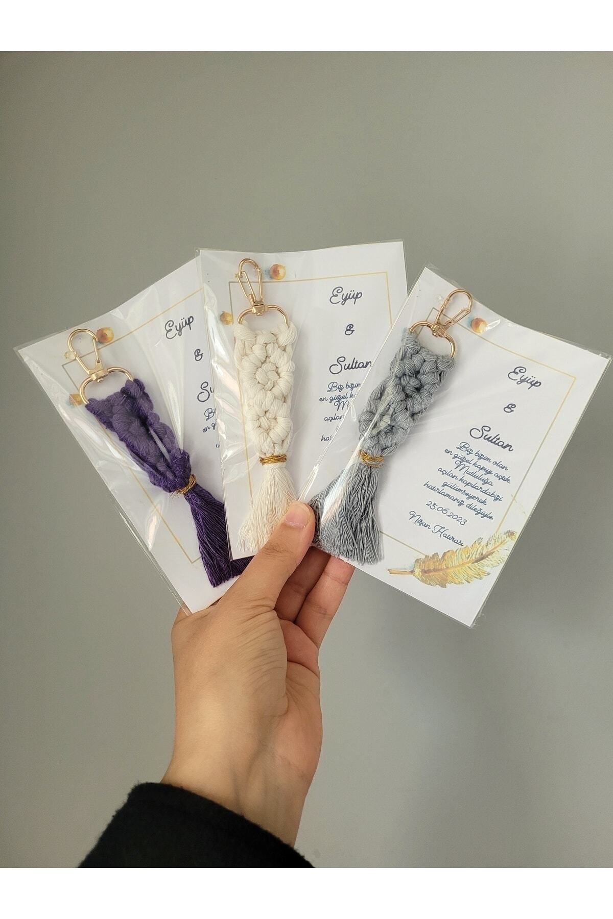 - Diğer Özellikler : 35 macrame keychains. Keychains are ecru. All have evil eye beads. Keychain length is around 16 cm. Text is added.