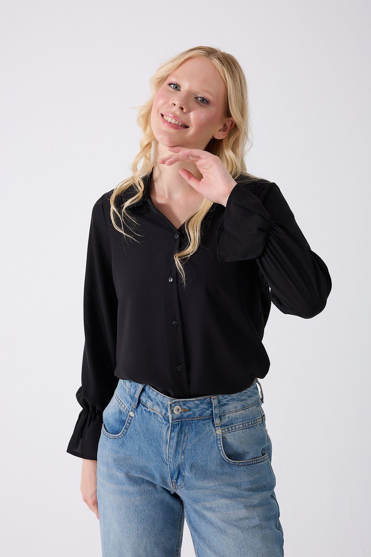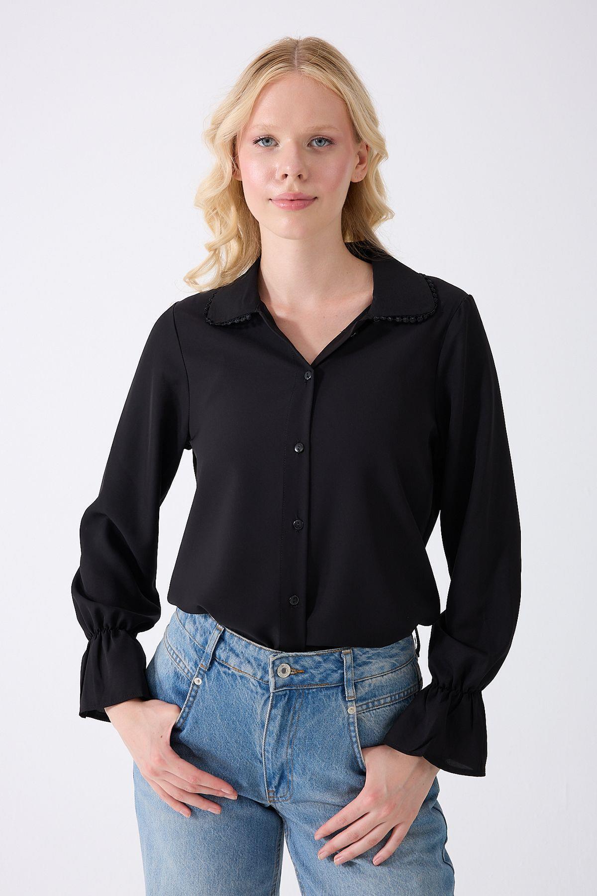 Kadın Siyah Büzgülü Kol Dantenli Yaka Detaylı Dokuma Gömlek Kadın Siyah Büzgülü Kol Dantenli Yaka Detaylı Dokuma Gömlek FUMEL-0303 XL