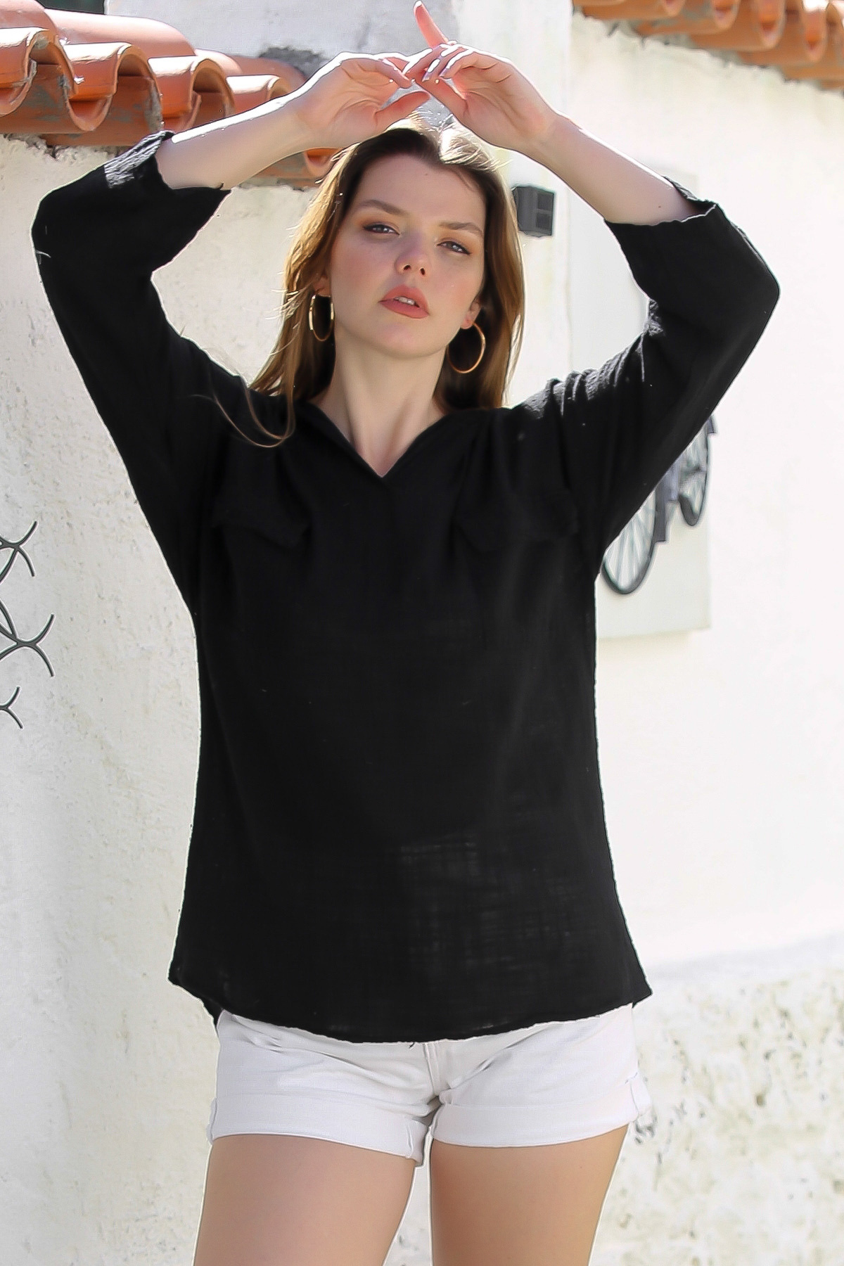 Siyah Kapüşonlu Düğmeli Uzun Kollu Çift Kapaklı Cepli Yıkamalı Casual Dokuma Bluz 72 62 Siyah Kapüşonlu Düğmeli Uzun Kollu Çift Kapaklı Cepli Yıkamalı Casual Dokuma Bluz 72 62 M10010200BL91404 XL